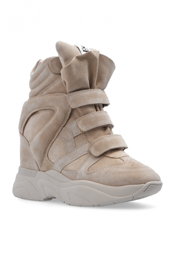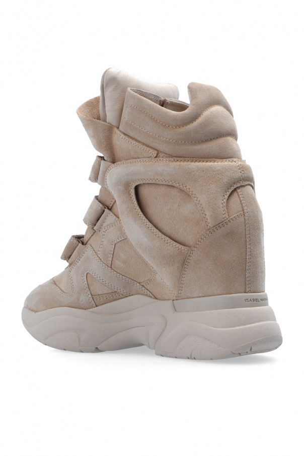Beige ‘Balskee’ wedge shoes from Isabel Marant. Crafted from leather and suede, this model features velcro closures, a logo patch on the front and a beige rubber sole at the base.