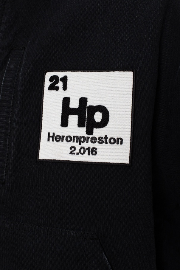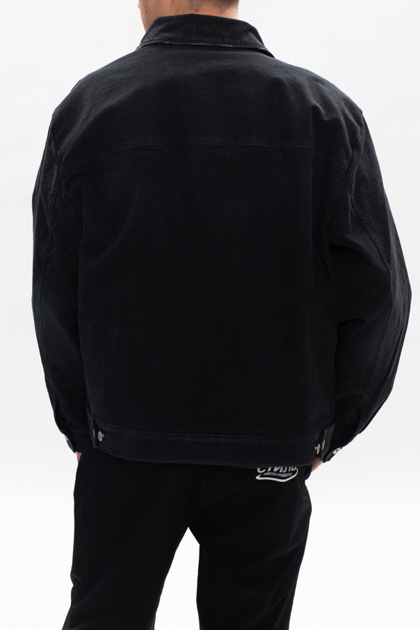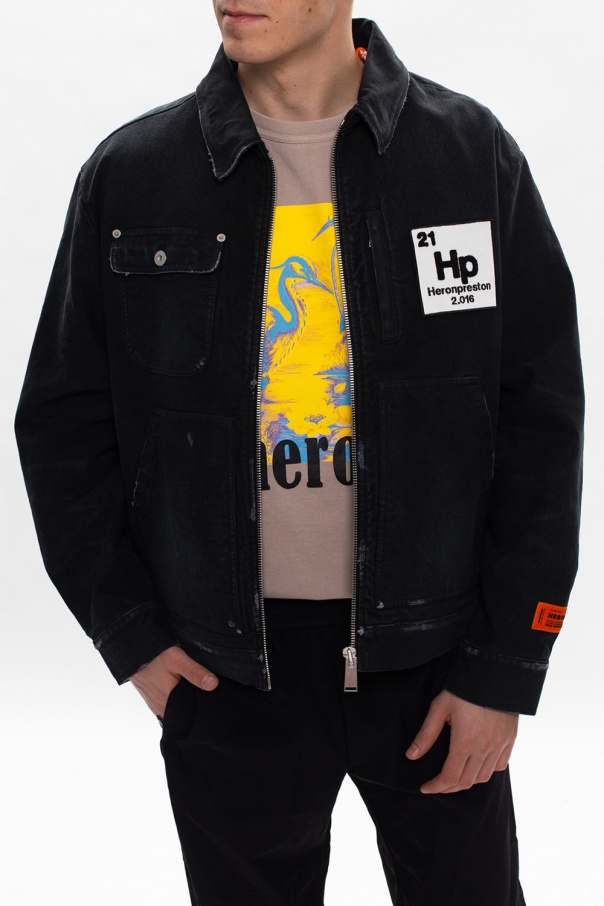 Dark grey denim jacket from Heron Preston. Crafted from stonewashed cotton, this style boasts a black and white logo patch for the designer recognition, three welt pockets, one button-fastened flapped pocket and silver-tone metal hardware.