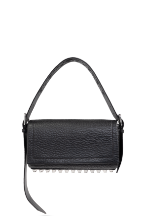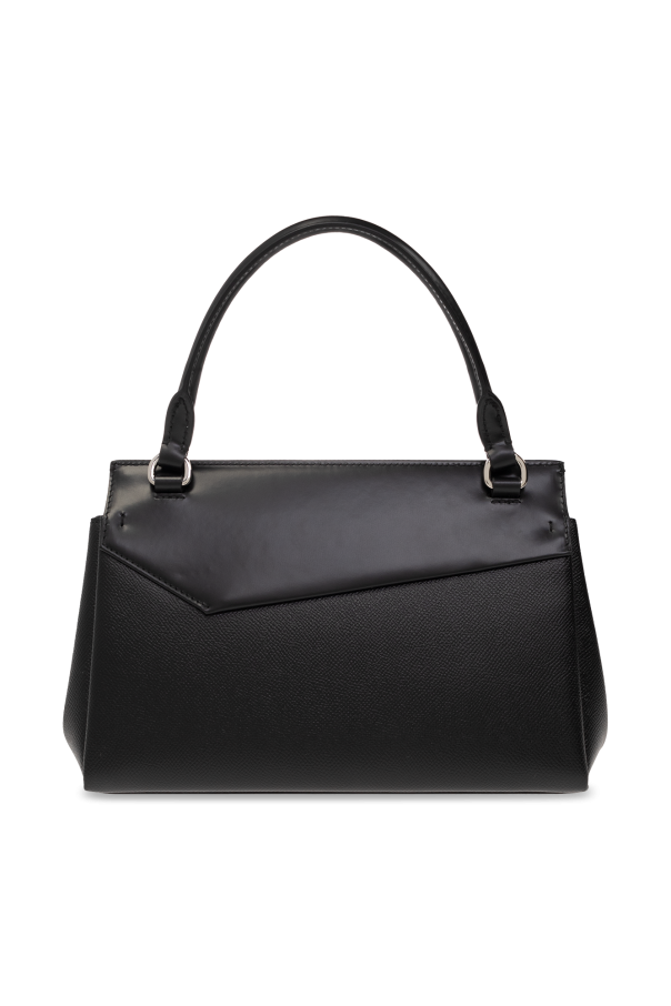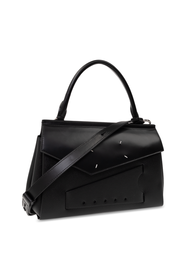 Black ‘Snatched’ shoulder bag from Maison Margiela. Crafted from leather with an asymmetrical silhouette inspired by origami, this design secures with a magnetic snap and showcases the brand's signature white four stitches moniker. It is complete with a detachable and adjustable shoulder strap, two handles (the front one is perforated), light gold-tone metal hardware and one internal compartment with a slip pocket.