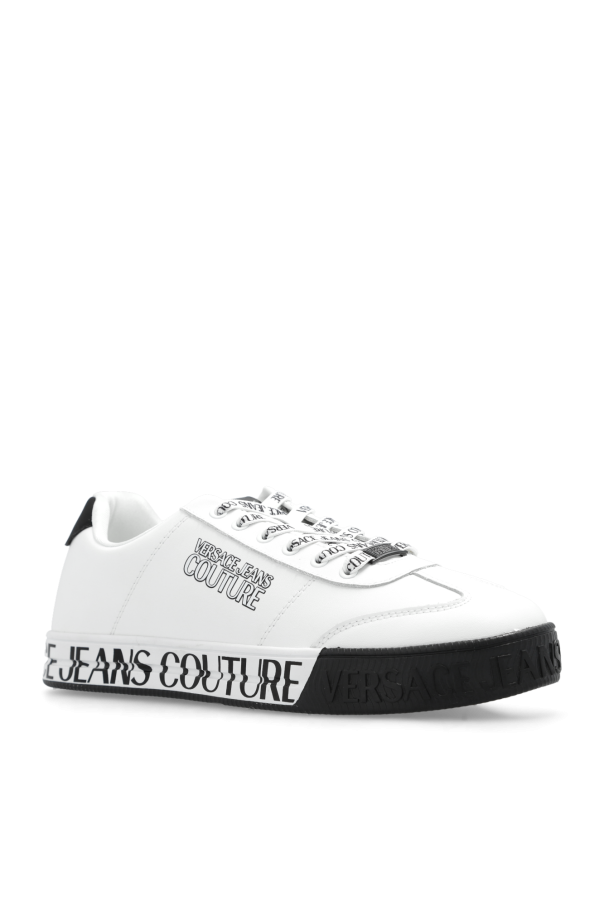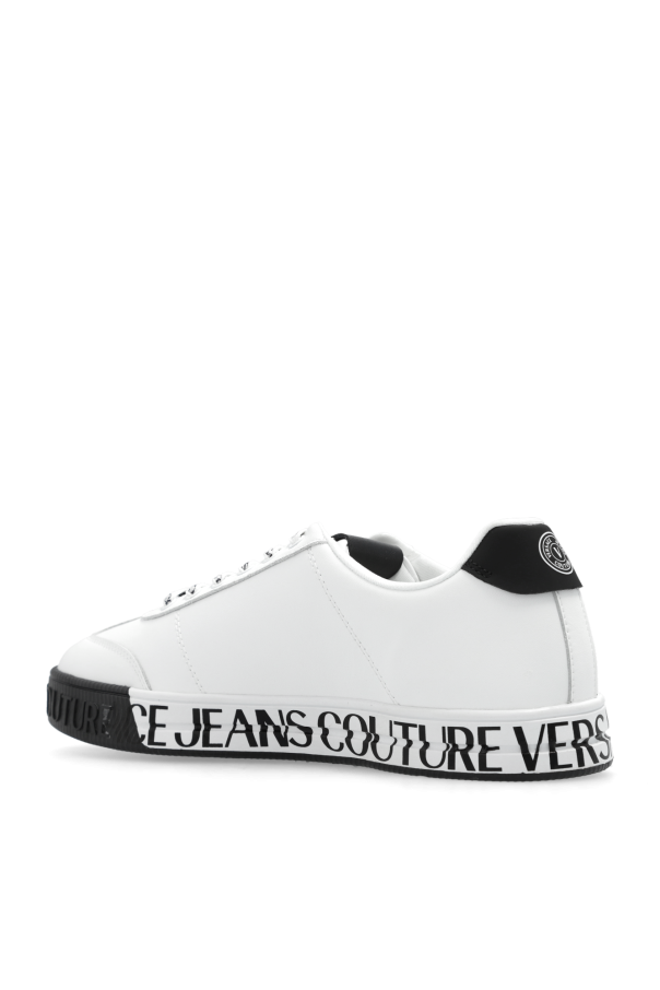 White and black sneakers from Versace Jeans Couture. Made from smooth leather, this lace-up model sits on a black and white rubber sole and showcases a printed logo.