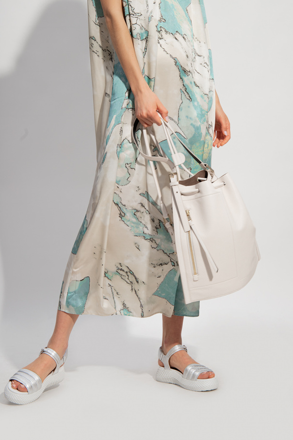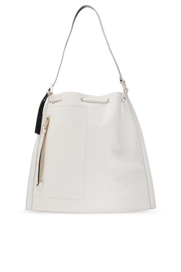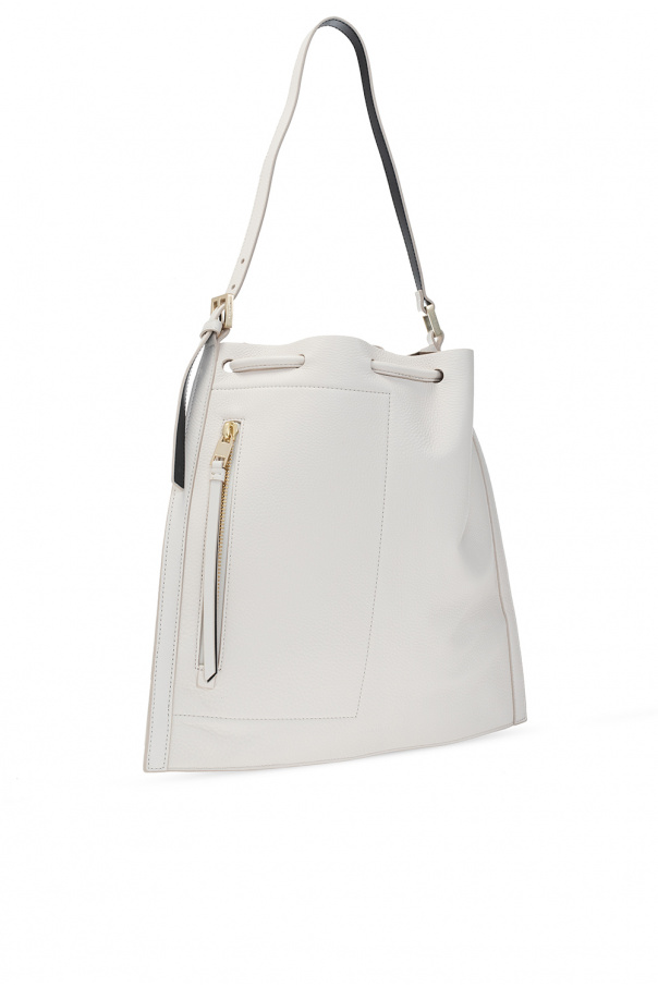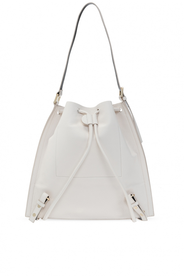 White ‘Alpha’ backpack from AllSaints. Crafted from leather, this design features a drawstring fastening, embossed logo, front zip pocket, adjustable shoulder straps, gold-tone metal hardware and one internal compartment with one slip pocket. Can be worn as a shoulder bag.