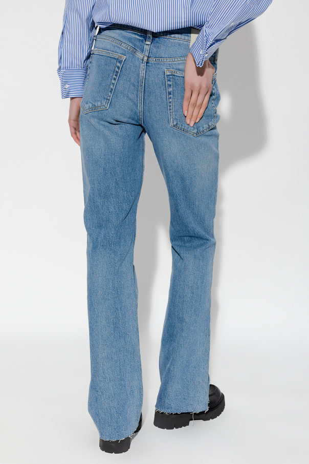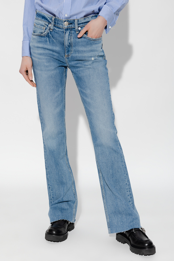 Blue ‘Peyton’ jeans from Rag & Bone. Falling with straight legs, this pair features a zip fly with a button, classic five pockets, frayed hems and distressed detailing.