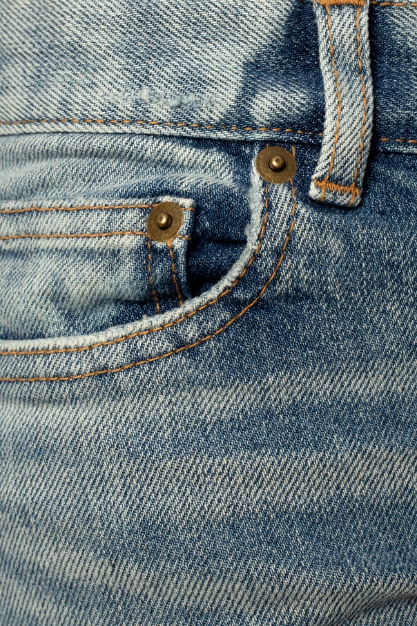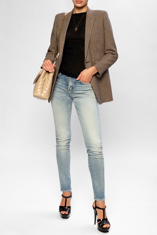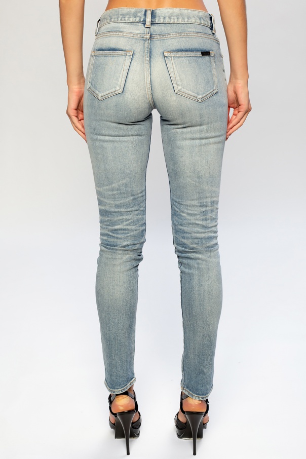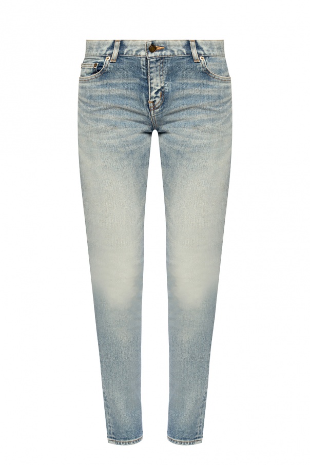 Blue jeans from Saint Laurent. Falling down with legs that taper towards the ankles, this pair is complete with zip fly and top button closing as well as five pockets – the back one is adorned with a black logo-embossed patch.