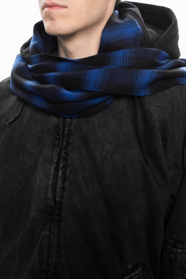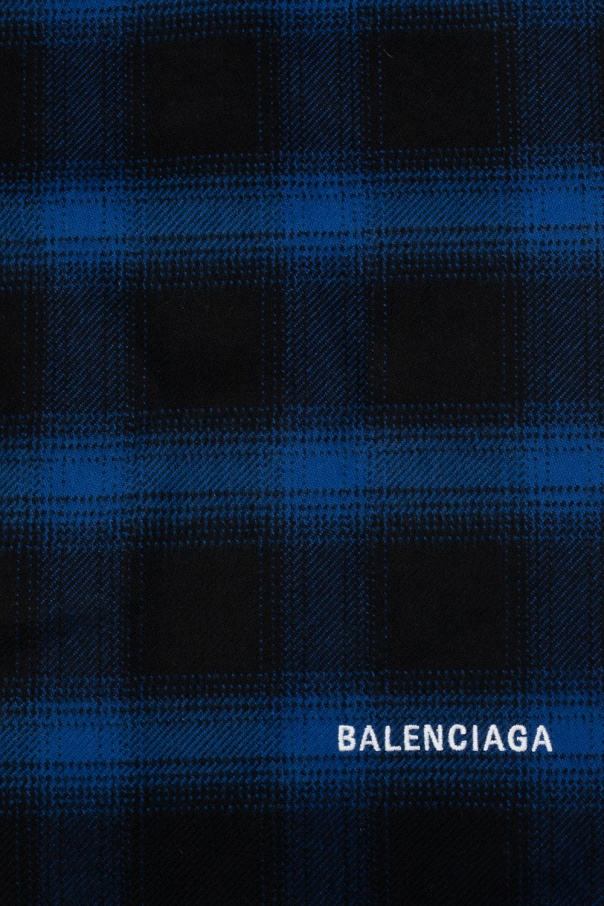 Black and navy hooded scarf from Balenciaga. Made of wool and cotton, this design features an embroidered check pattern, logo and raw edge.