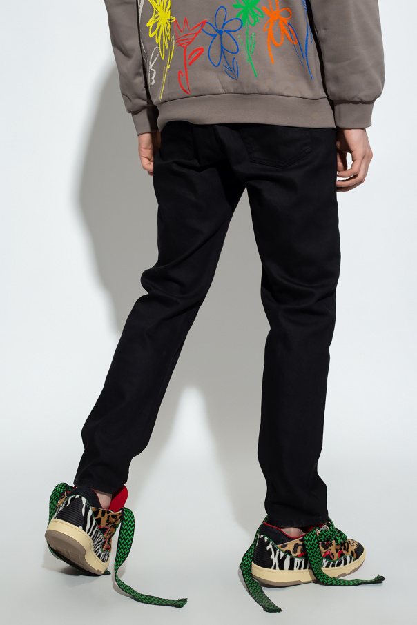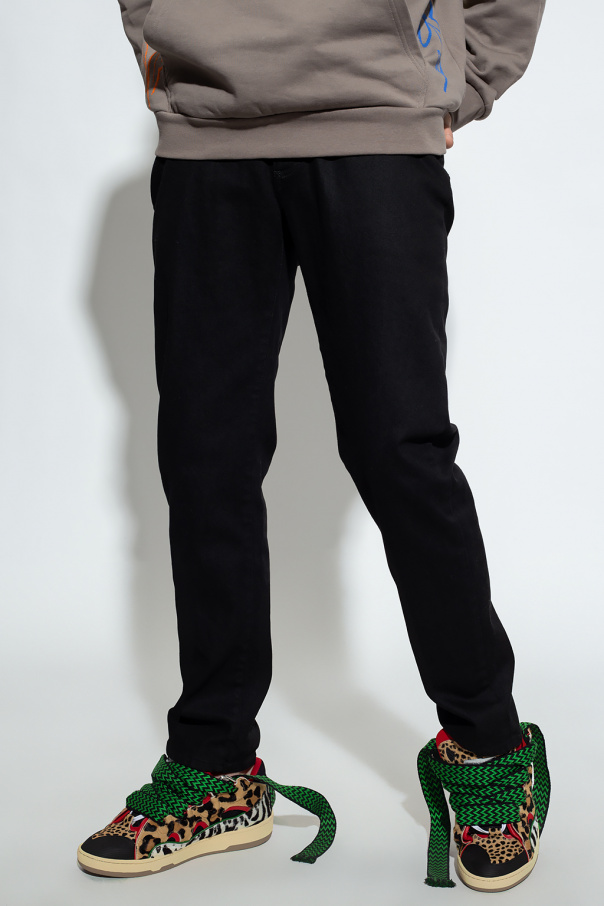Black ‘Crude’ jeans from 44 Label Group. Fastened with buttons, this pair falls down with straight legs and is complete with a logo embroidery, light brown logo patch, three front pockets and two back pockets.