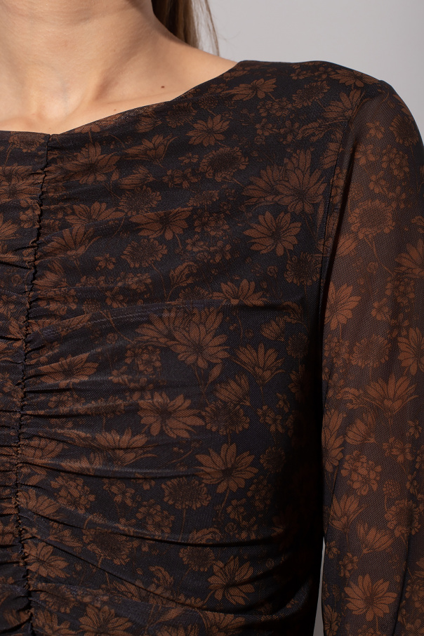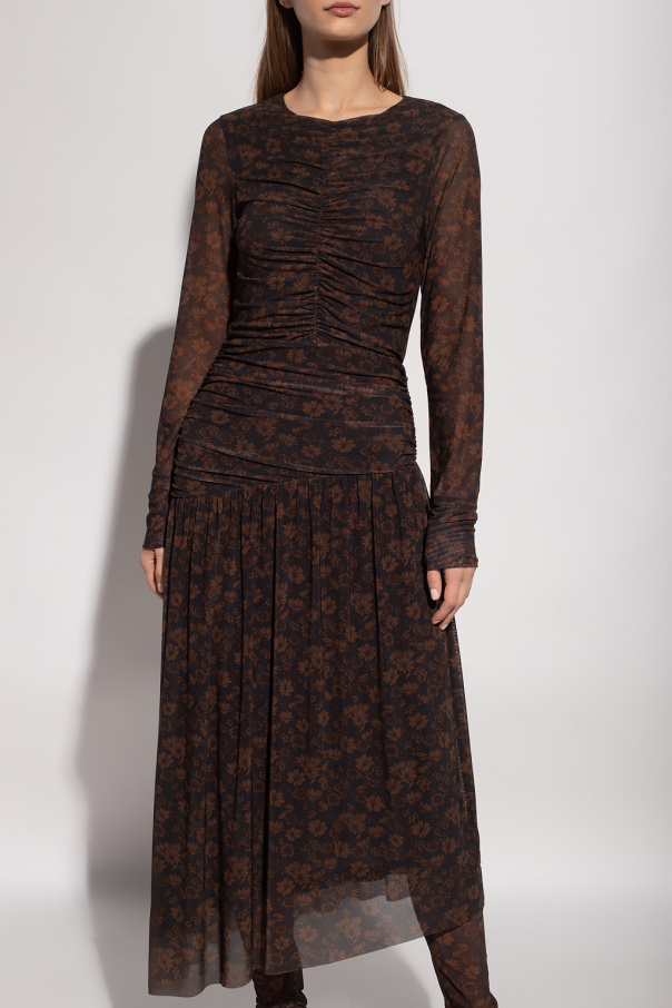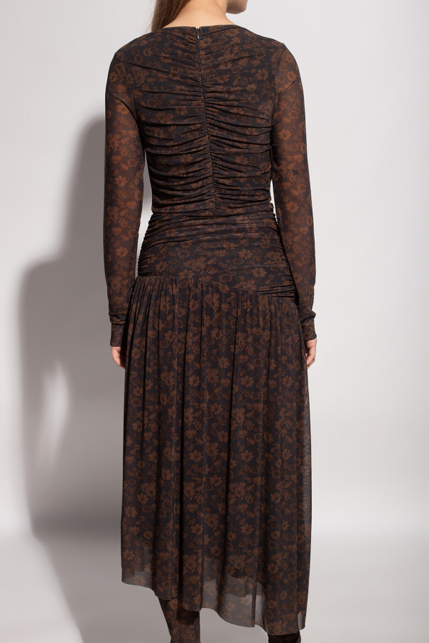 Black and brown dress from Ganni. Embellished with a floral motif, this style features a zip fastening on the back, distinctive draping and long, sheer sleeves.