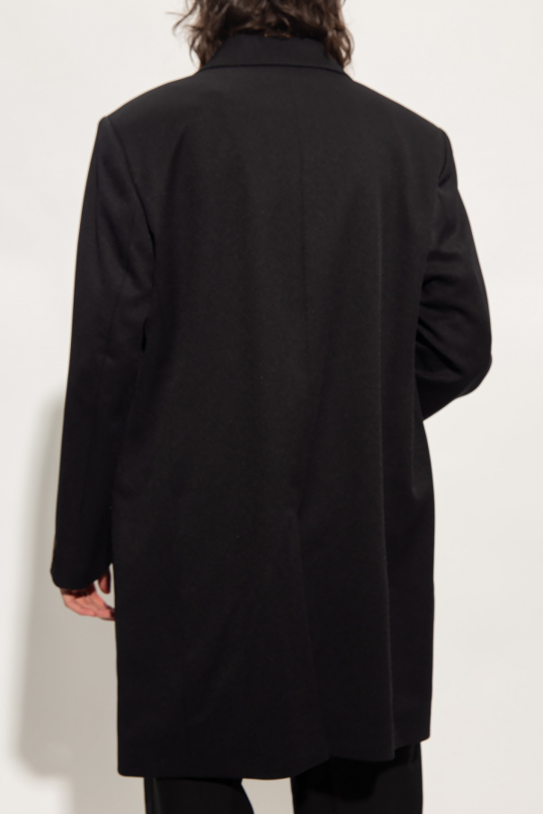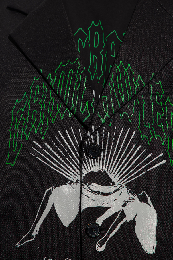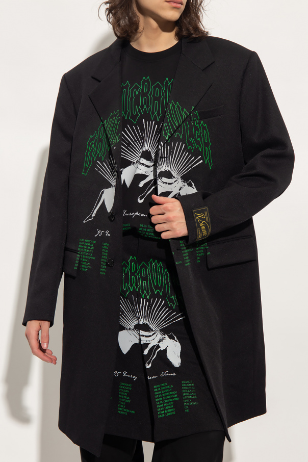Black coat from Raf Simons. Made of cotton, this style showcases a green and light grey graphic print. It is complete with button fastenings, notch lapels, one slip pocket and two flapped pockets on the front, a single back vent and long sleeves – one has a logo patch.