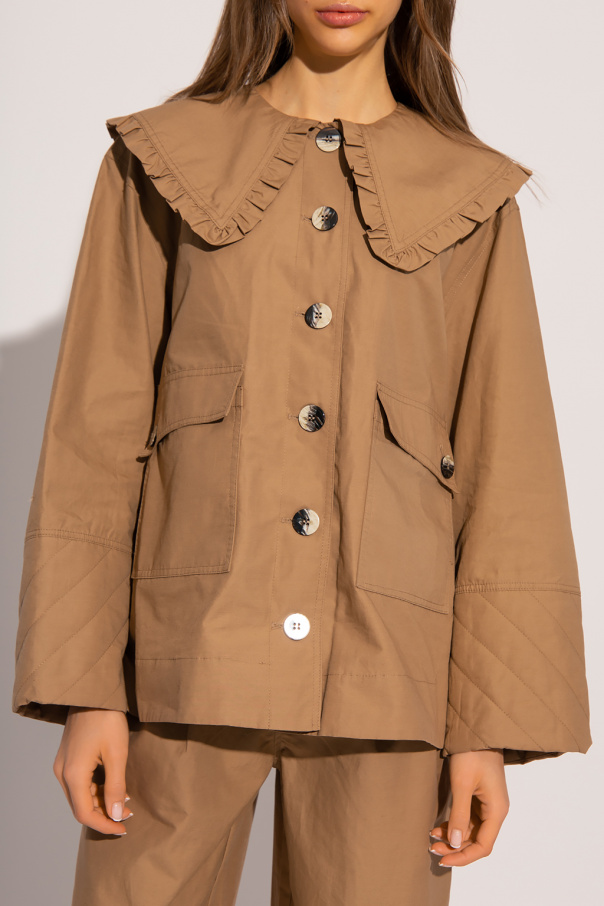Brown jacket from Ganni. Crafted from a linen and organic cotton blend with an oversize fit, this style features button fastenings, an exaggerated collar with ruffle detailing, two slip pockets, two flapped button pockets and long sleeves with quilted cuffs.