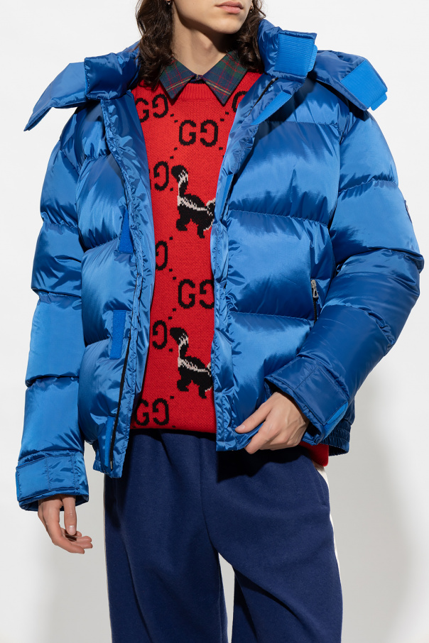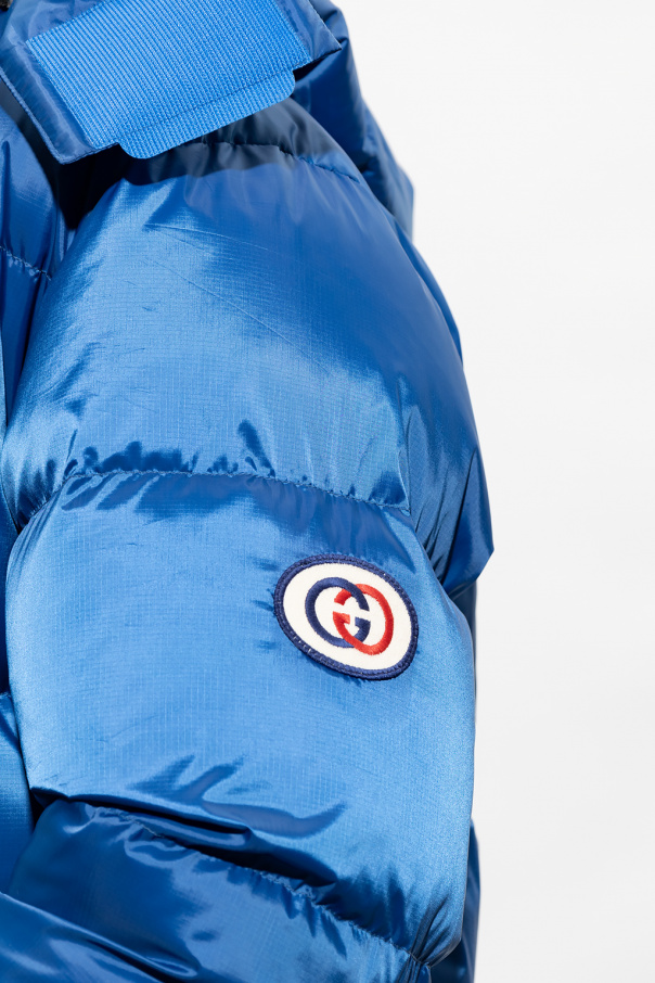 Blue jacket from Gucci. Filled with goose down, this style secures with a zipper and velcro and features a detachable drawstring hood, two zip front pockets and long sleeves – one has a logo patch.