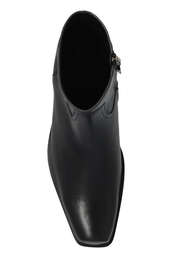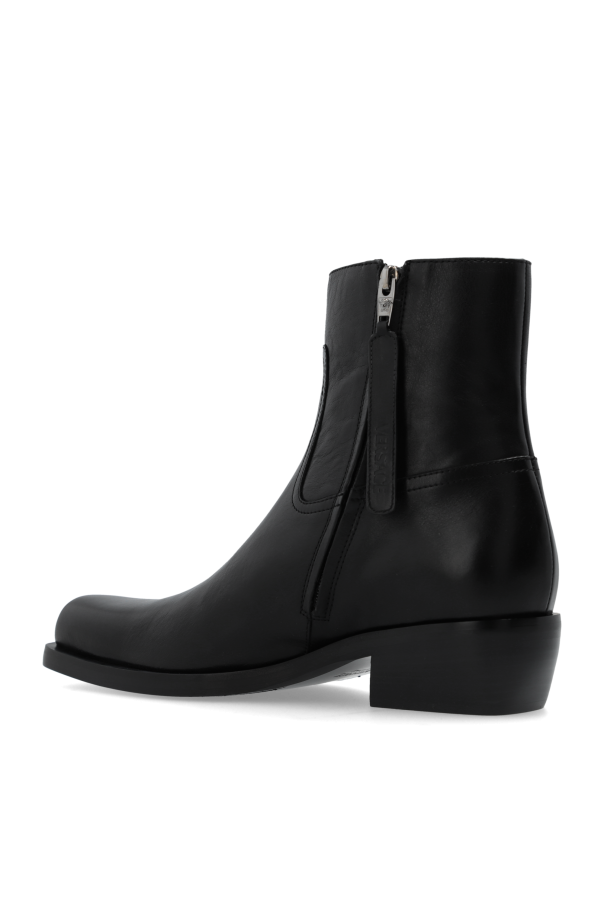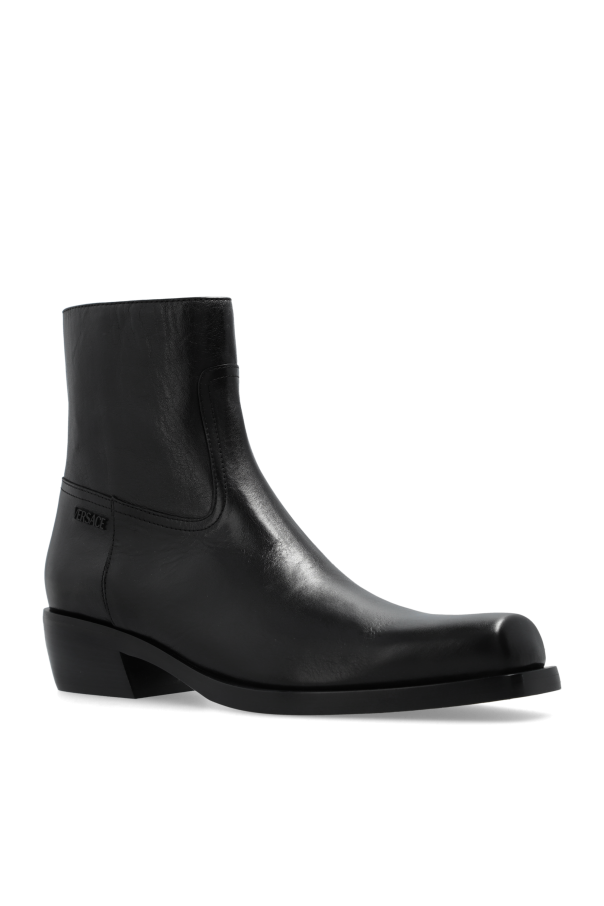 Introducing the quintessence of luxury and sleek design, the Versace Heeled Ankle Boots. Crafted from the finest 100% leather, these black boots exude sophistication with their smooth texture and classic, unzipped silhouette. The rounded front elegantly contours the foot, offering a timeless charm that complements any ensemble. The subtle presence of the designer\'s logo on the side, near the ankle, not only marks the authenticity of these exquisite boots but also serves as a testament to their high-fashion lineage. With a comfortable, stable heel, these boots promise not just unrivaled style but also commendable comfort, making them perfect for both day-long wear and evening outings. Their minimalist aesthetic, accentuated by a clean, decoration-free design and an ankle-length finish, aligns seamlessly with a modern, elegant wardrobe. These boots, while understated, are meticulously crafted to enhance the grace and poise of the wearer. Why Purchase These Heeled Ankle Boots? Exclusive Versace design, ensuring a touch of luxury. Made from premium-quality leather for durability and elegance. Comfortable heel height for optimal wearability. Sleek, minimalist design that complements any outfit. Subtle designer emblem as a hallmark of authenticity and style.