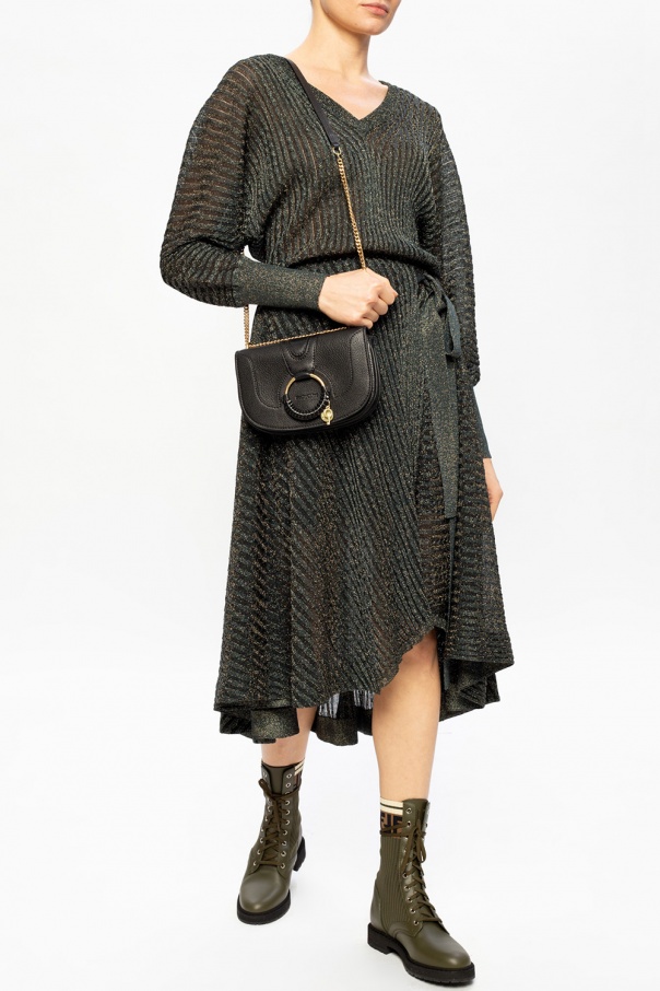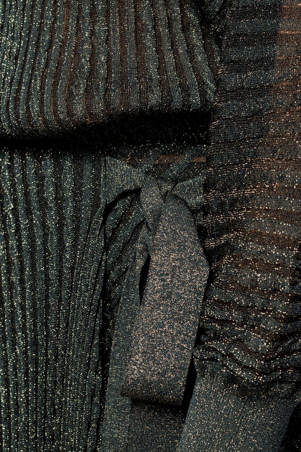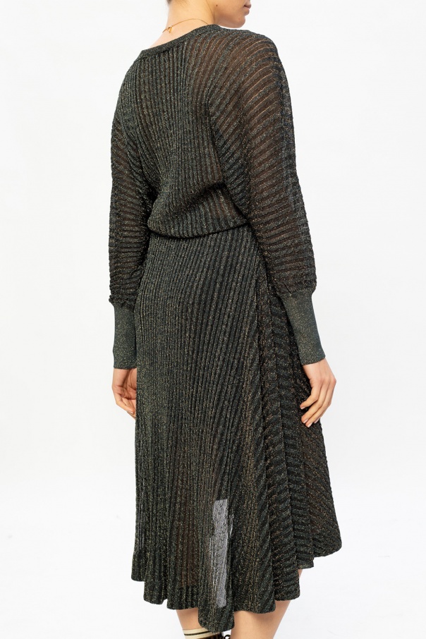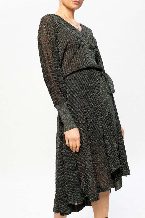 Grey and green asymmetrical ribbed dress from Chloé. Tied at the waist, this V-neck design features long sleeves, gold-tone lurex yarn trims and a black chemise.