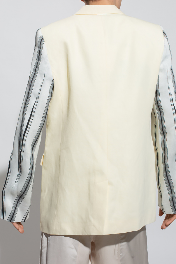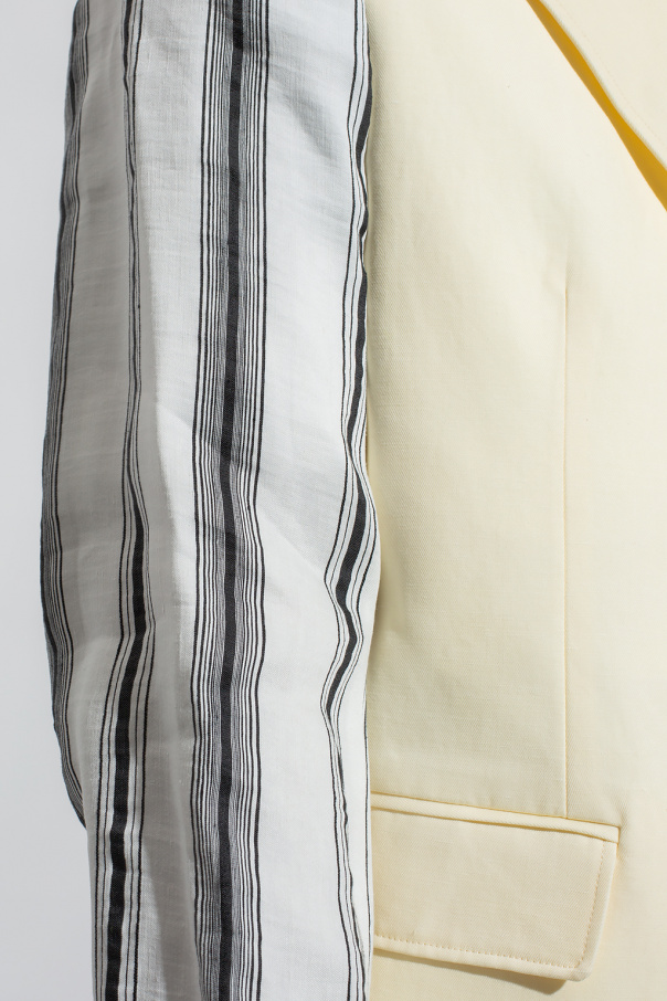 Light yellow ‘Malick’ blazer from Wales Bonner. Made of a linen, cotton and silk blend, this pair is complete with button fastenings, one slip pocket, two flap pockets, single rear vent, notch lapels and long sleeves with a white and black stripe pattern.
