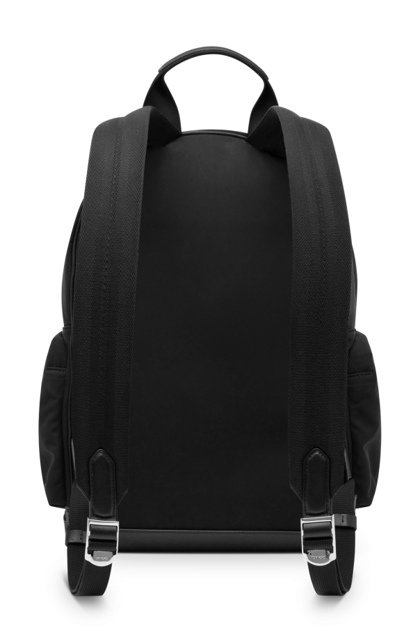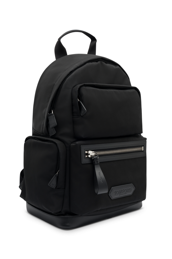 Black backpack from Tom Ford. Made of recycled calf leather blend, this design features a two-way zip, logo-embossed patch, four zip pockets, top handle, adjustable shoulder straps, silver-tone metal hardware and one internal compartment with a snap-fastened laptop pocket.