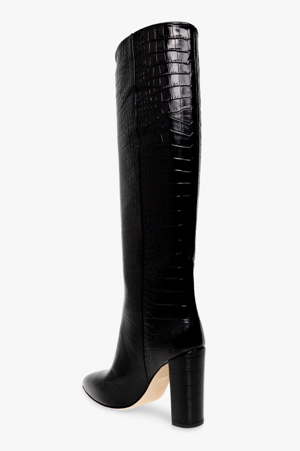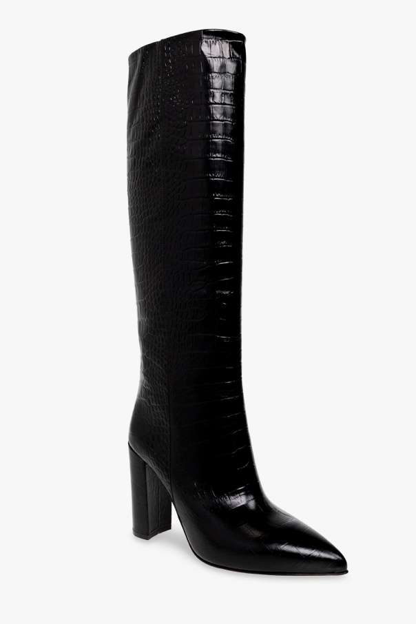 Black heeled boots from Paris Texas. Crafted from leather with a crocodile skin effect, this pointed toe design rests on a light brown leather sole.
