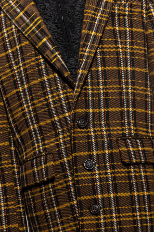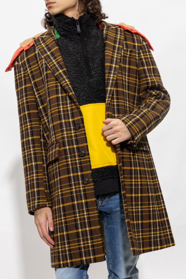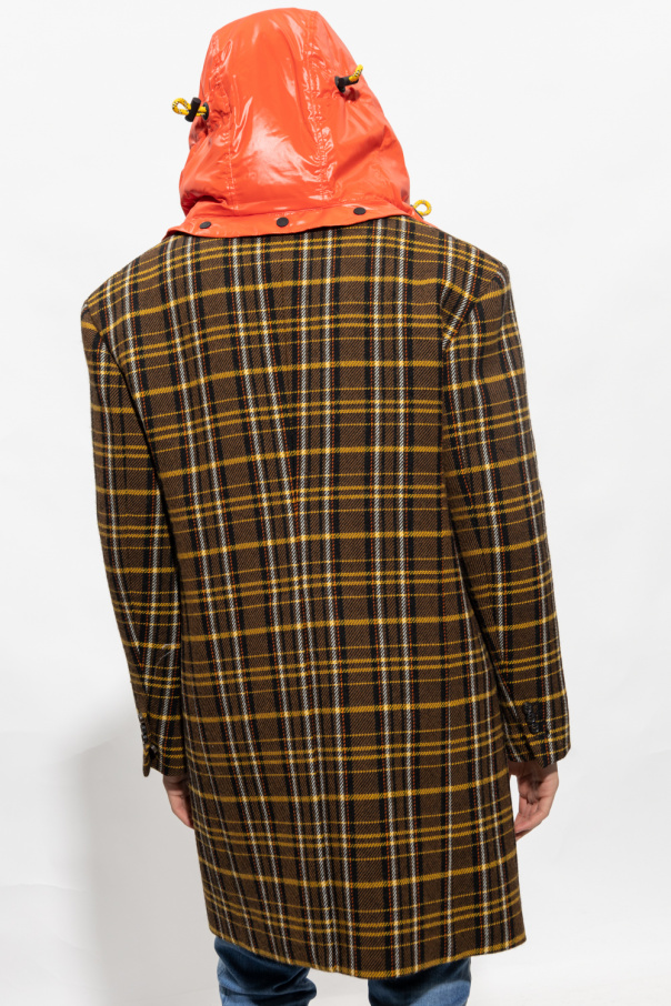 Brown coat from Dsquared2. Crafted from wool, this style secures with buttons and showcases a colourful check pattern. It is complete with peak lapels, a detachable red hood with drawstrings and beige faux fur trimming, two flapped pockets on the front, a single back vent and long sleeves.