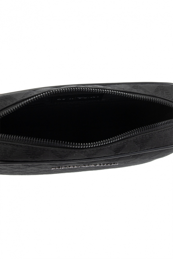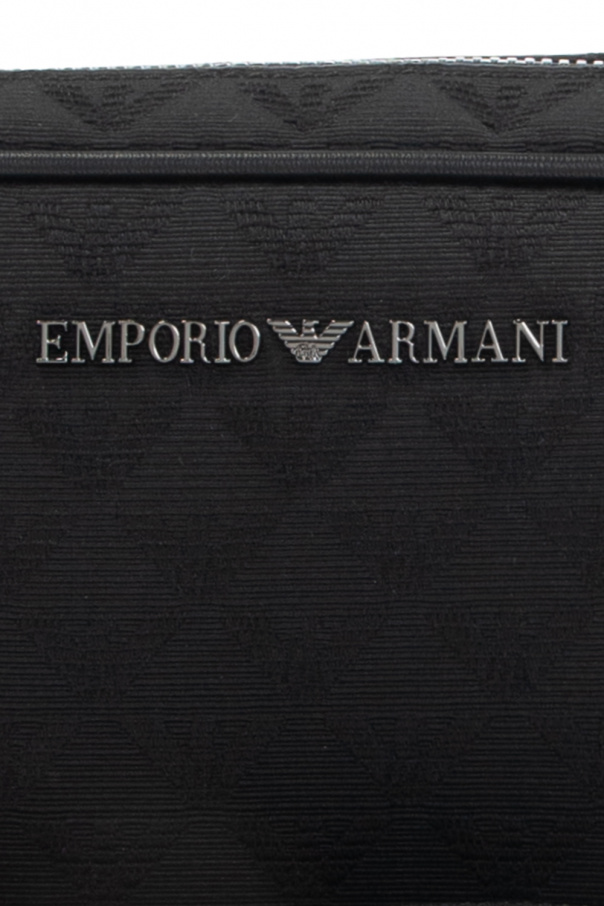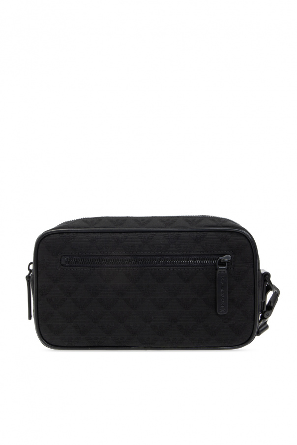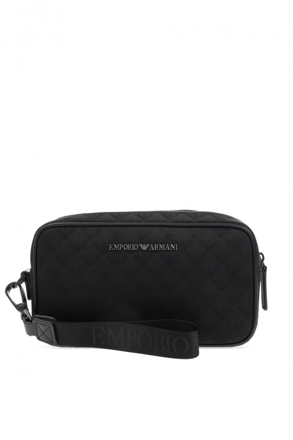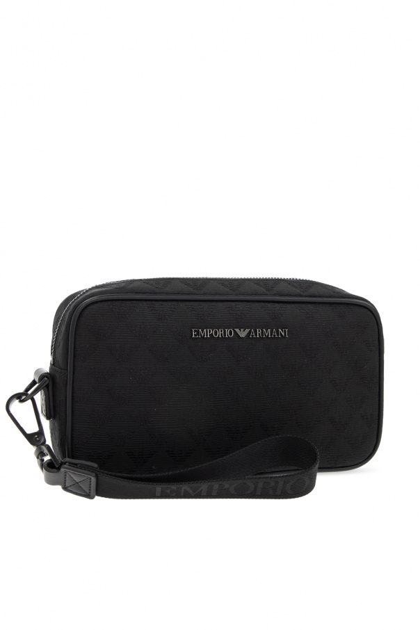 Black wash bag from Emporio Armani. Embellished with a jacquard pattern, this item features a zip-around fastening, a wrist strap, a metal logo plaque on the front, a zip pocket on the back and one internal compartment with one slip pocket and four card slots.