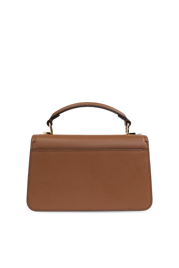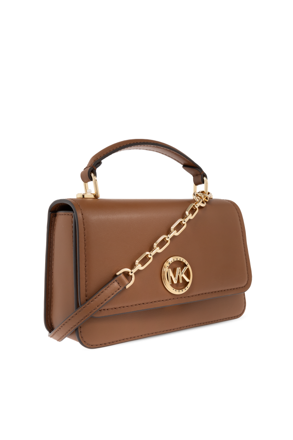 Introducing the Delancey Shoulder Bag from the esteemed Michael Kors collection. This exquisite brown accessory epitomizes sophistication and luxury, meticulously crafted to elevate your style. The Delancey boasts a rectangular silhouette with rounded corners, creating a harmonious balance between structure and elegance. Made from smooth, premium leather, this bag exudes a refined aesthetic, further accentuated by its sleek, unembellished front, adorned solely with the designer\'s iconic round gold logo featuring the initials \"MK\". The bag\'s gold chain strap adds a touch of opulence, while the leather top handle provides versatile carrying options. Inside, the bag is lined with signature fabric and includes a convenient slip pocket and three card slots, secured with a magnetic closure to keep your belongings safe. Why Choose This Product? Exquisite smooth leather construction for a luxurious feel Iconic Michael Kors gold logo for a touch of elegance Versatile design with both a chain shoulder strap and a leather top handle Functional interior with a slip pocket and card slots Magnetic closure for secure storage