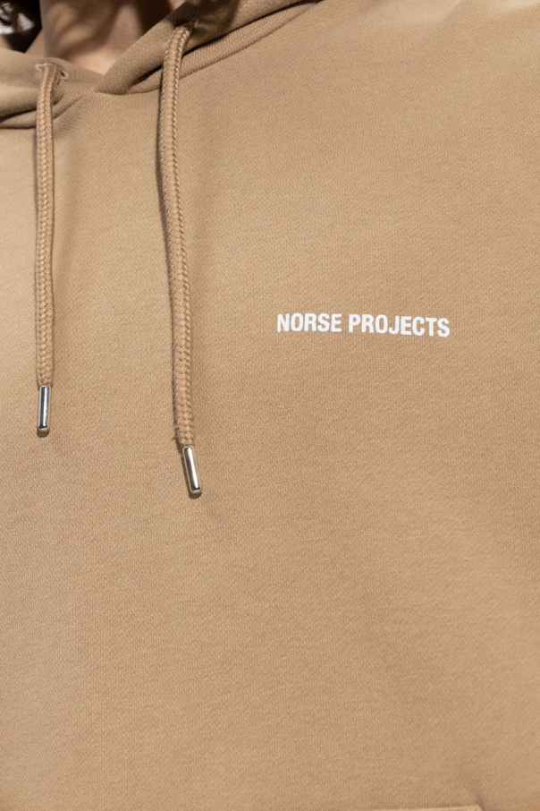 Beige ‘Arne’ sweatshirt with a drawcord-adjustable hood from Norse Projects. Crafted from cotton jersey, this style features a kangaroo pocket and a printed white logo on the front and ribbed trims on the bottom hem and long sleeves.