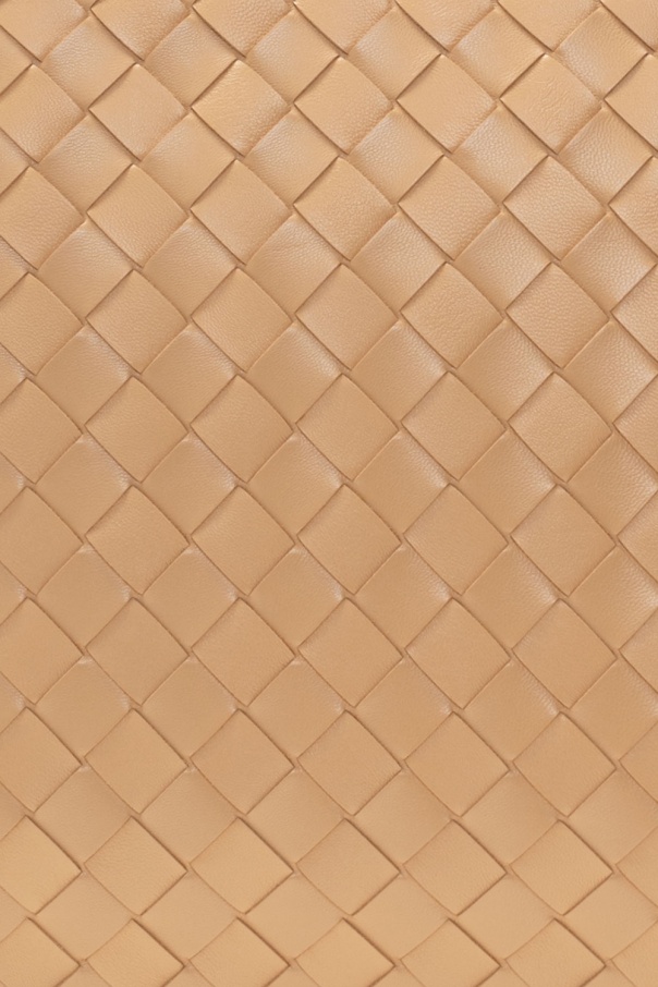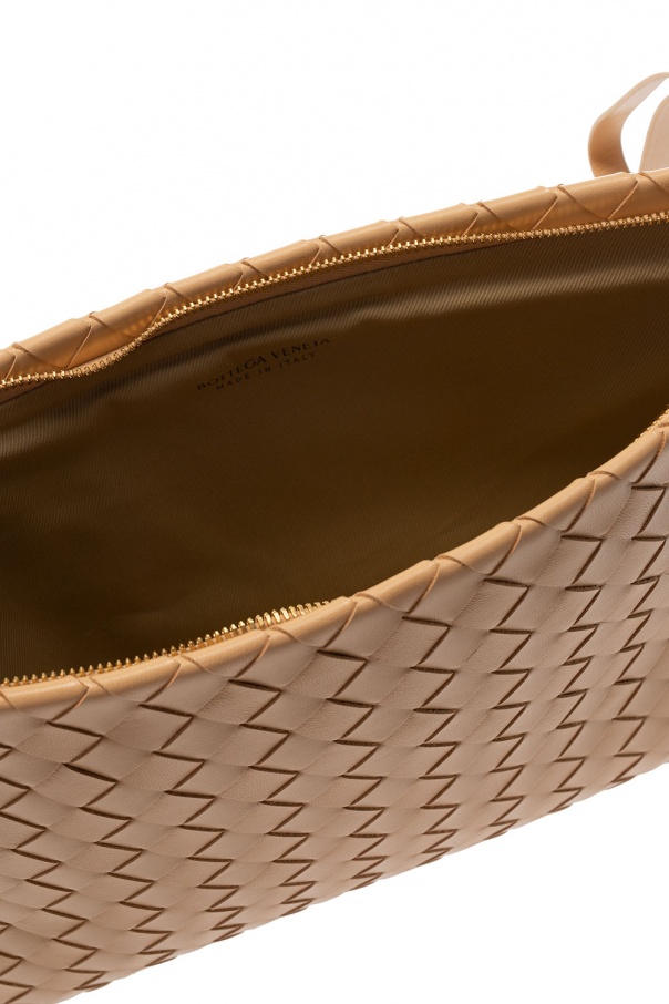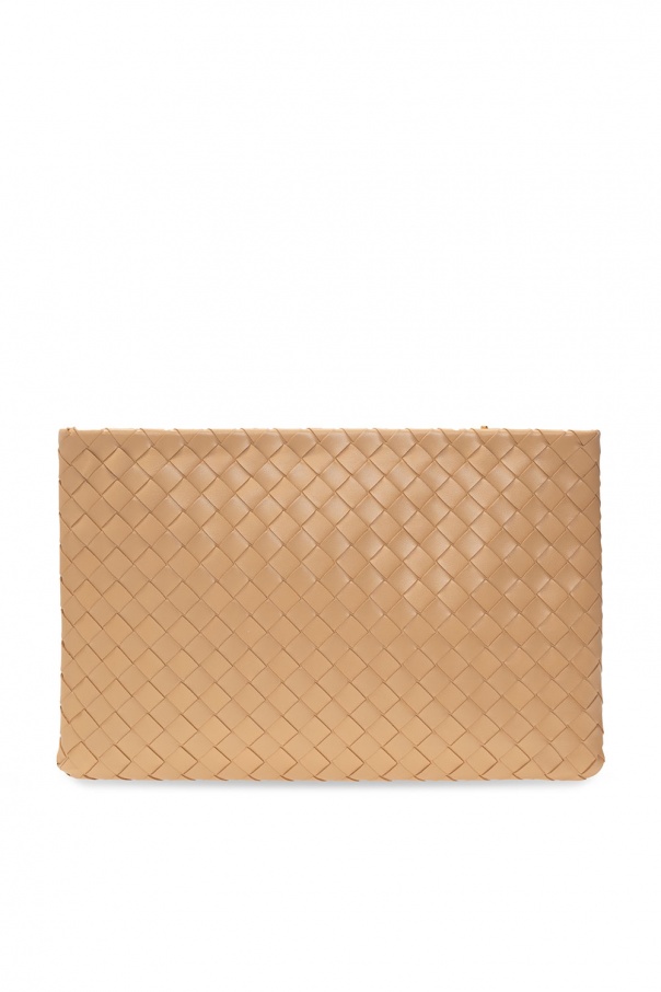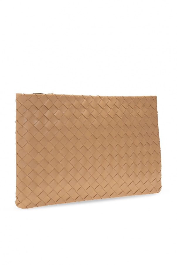 Beige clutch from Bottega Veneta. Crafted from lamb leather with the label's iconic 'Intrecciato' weave, this design fastens via a zip and features a detachable wrist strap, gold-tone metal hardware and a cotton-clad interior with one compartment.