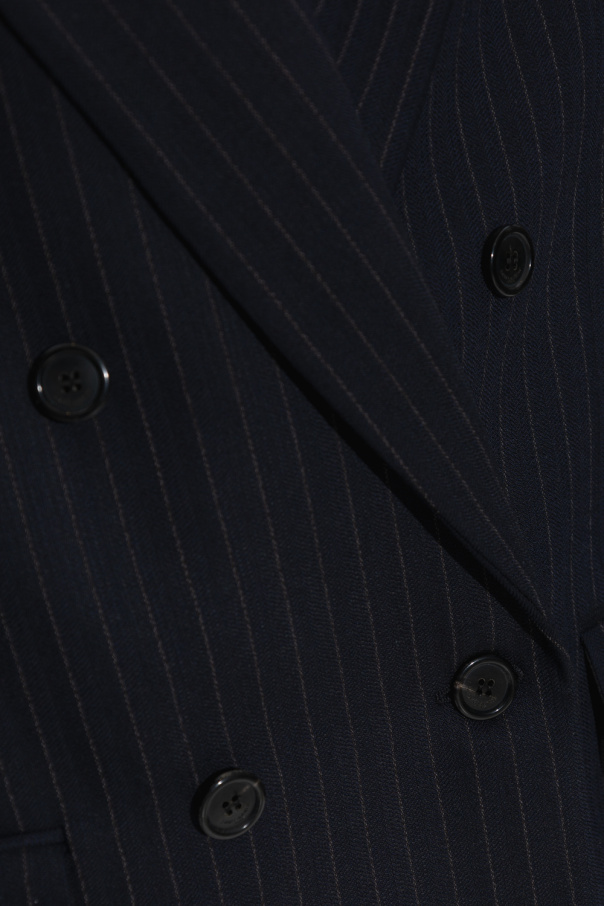 Navy double-breasted blazer with peak lapels from Saint Laurent. Made of wool, this design features buttons, beige pinstripes, two flap pockets, one slip pocket, long sleeves, single rear vent and silk lining.
