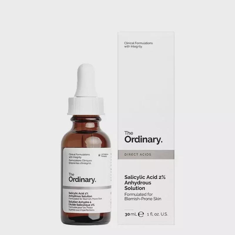 The Ordinary - Salicylic Acid 2% Anhydrous Solution - безводна сироватка з саліциловою кислотою, яка м'яко, але ефективно відлущує омертвілий епідерміс, очищає сальні залози від забруднень і регулює вироблення шкірного сала. Сироватка заснована на сквалані, що регенерує шкіру, заспокоює подразнення та зволожує її. Є веганським засобом.