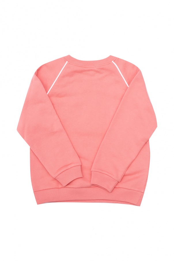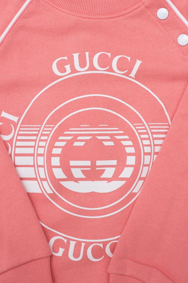 Pink crewneck sweatshirt from Gucci Kids. Crafted from cotton jersey, this item features a white graphic print with the brand's logo, snap fastenings on the front and ribbed finishes on the bottom hem and cuffs.