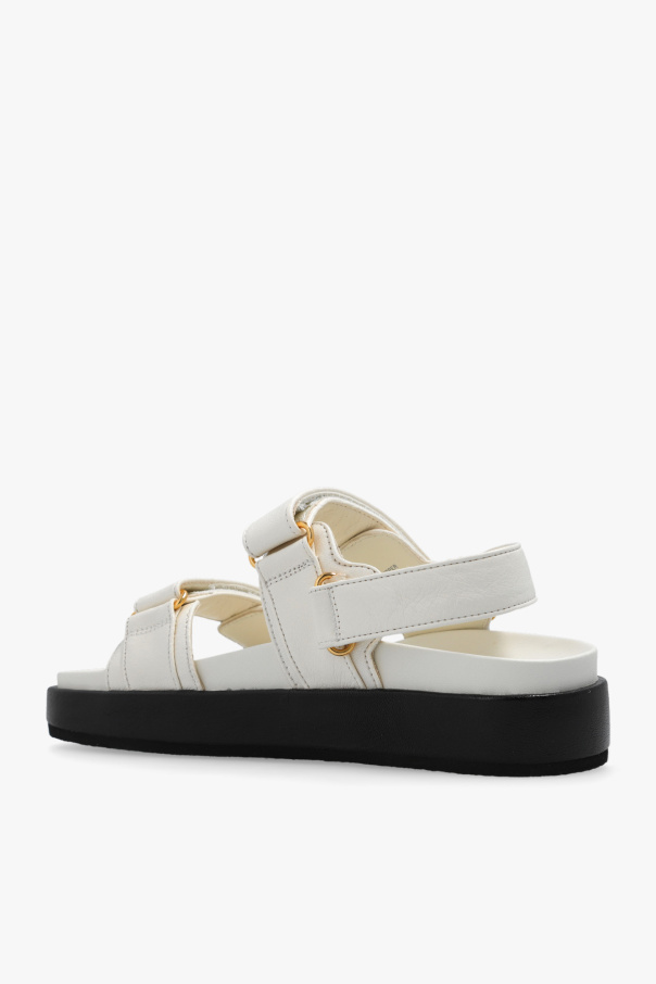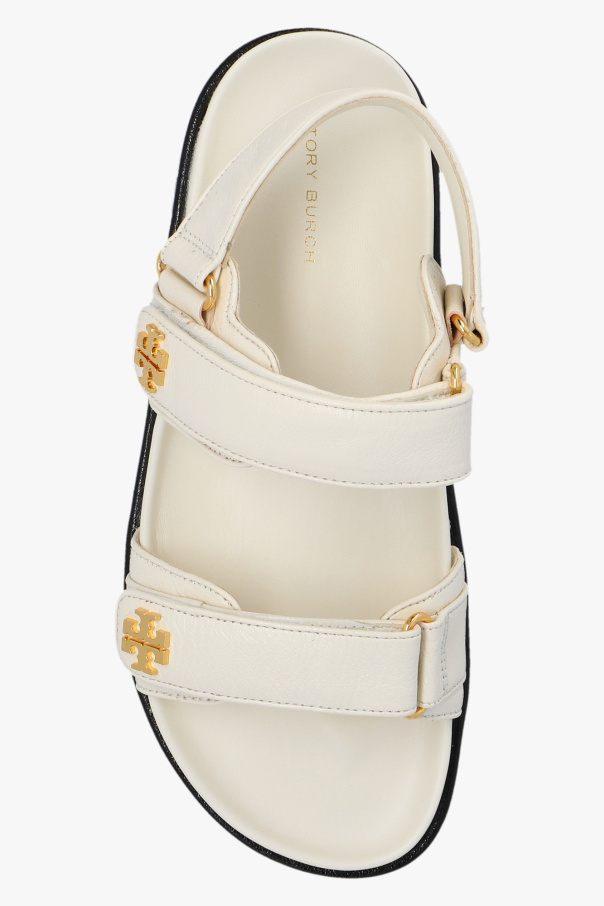 Cream and black ‘Kira’ sandals from Tory Burch. Made of leather, this model sits on a black rubber sole and features velcro closures and gold-tone logo-shaped applications.