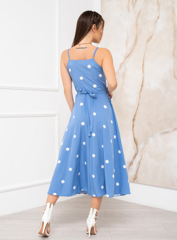 Сарафан в горох с втачным поясом, выполненный из софта. Модель миди длины с декольте и тонкими бретельками. Изделие с расклешенной юбкой и кроем платья-халата.