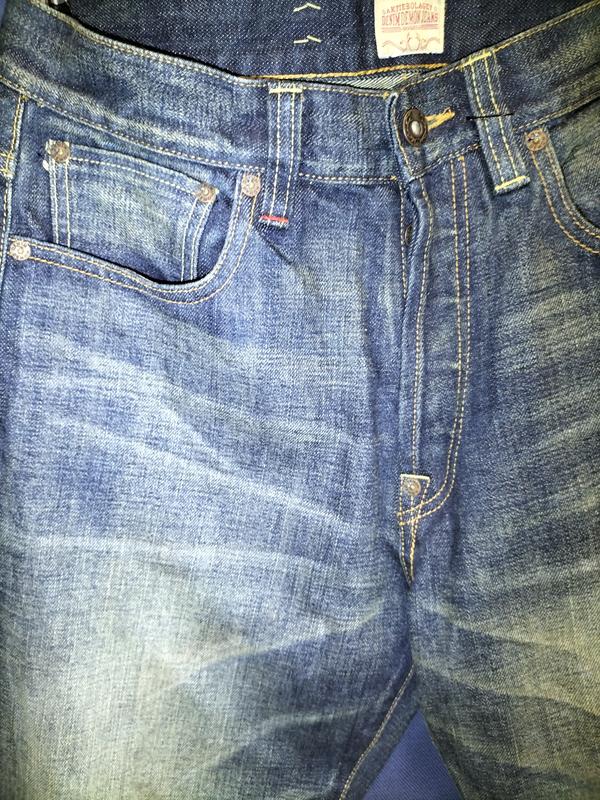 Стан идеален (новые),японский селвидж,штучный фейд и старение.Цвет сине - голубой, высветленный, с еффектом загруждения (при увеличении фото будет понятно). Высокая посадка, прямой крой.Унисекс. Нпояс 42 см стегна 55 см