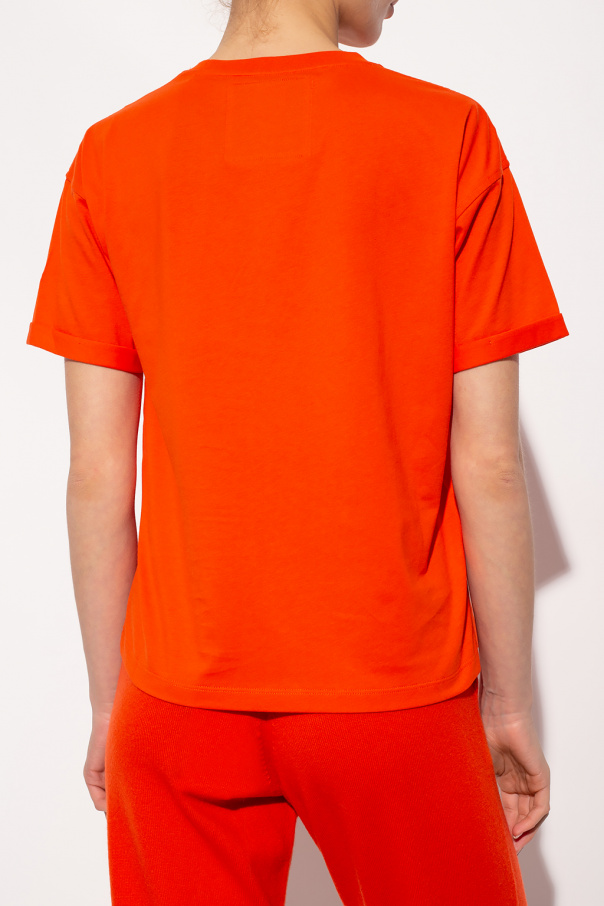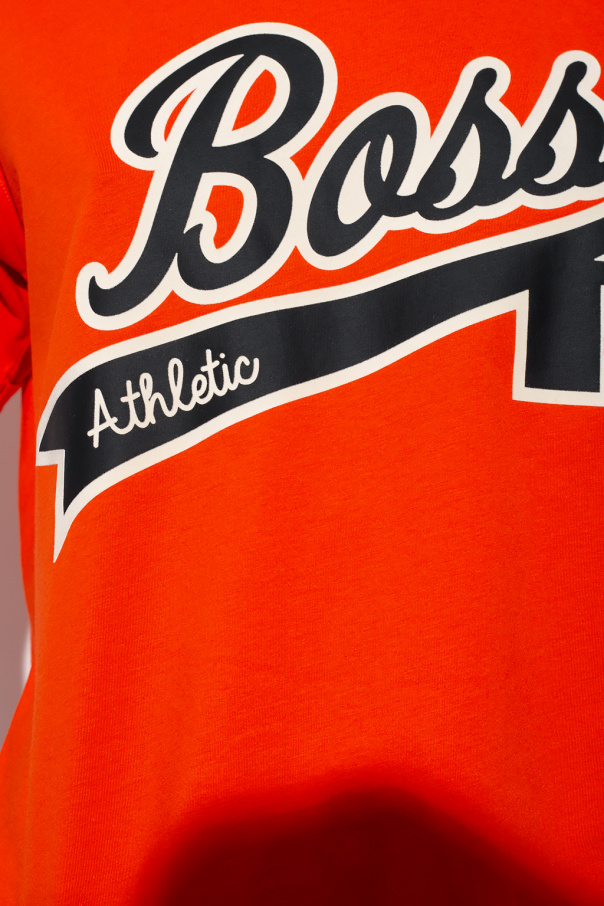 Orange crewneck T-shirt from BOSS x Russell Athletic. Crafted from cotton, this style showcases a velvet-flocked print with the brand\'s logo.