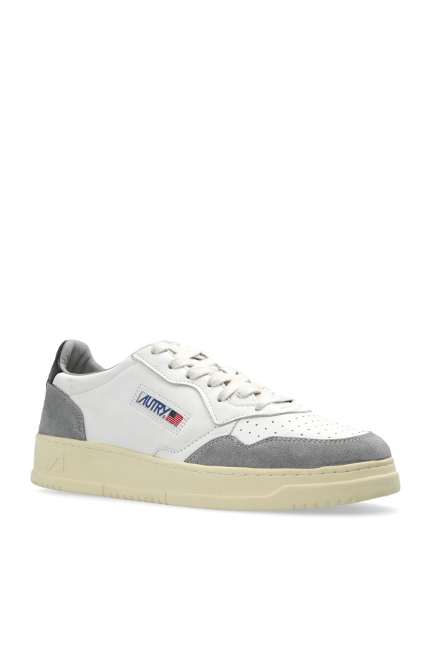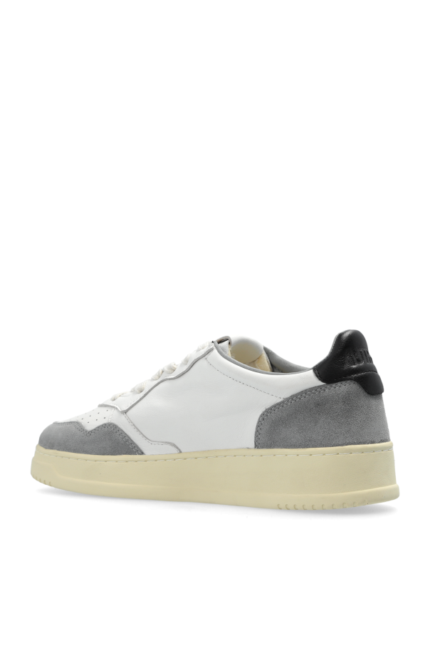 Introducing the distinguished Medalist Low sneakers by Autry, a sublime fusion of vintage charm and contemporary finesse. These low-top sneakers exude an effortless yet refined style, perfect for the modern connoisseur. Expertly crafted with a pristine white leather upper, these shoes feature sophisticated gray suede inserts around the toe and heel, complemented by a chic black suede patch at the rear. The side profile is adorned with the iconic Autry logo and an American flag emblem, epitomizing a timeless aesthetic. The Medalist Low showcases a meticulously engraved \"AUTRY MEDALIST\" on the tongue, while the perforated front ensures optimal ventilation. The cream-colored sole enhances the sneakers\' classic vintage appeal, making them a versatile addition to any wardrobe. Why Choose the Medalist Low Sneakers? Exquisite blend of white leather and gray suede for a sophisticated look. Perforated design for superior breathability. Classic retro style with modern comfort. Iconic branding with the Autry logo and American flag emblem. Timeless cream sole for a vintage flair.