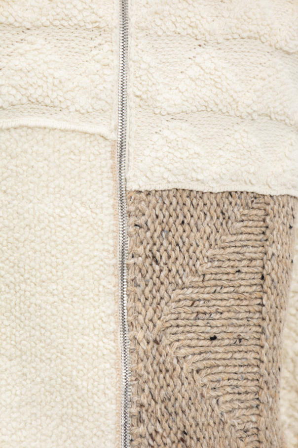 Cream and beige cardigan from Bottega Veneta. Fastened with a zip, this design features decorative knit details, patchwork effect, high neck and ribbed edges.