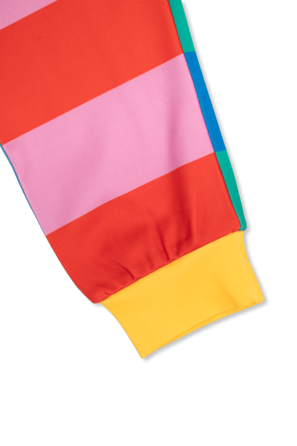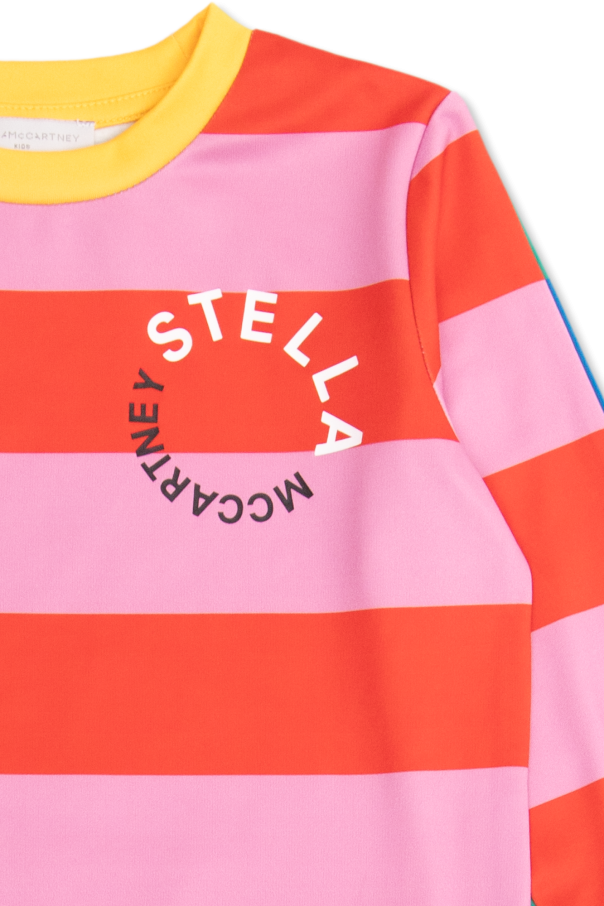 Multicolored thermal set including a top and trousers from Stella McCartney Kids. Crafted from recycled fabric, this set is decorated with a logo print. The top features a white and black logo print and long sleeves with a thumb loop. The trousers feature a pink elastic waistband with a logo and long legs with ribbed cuffs.