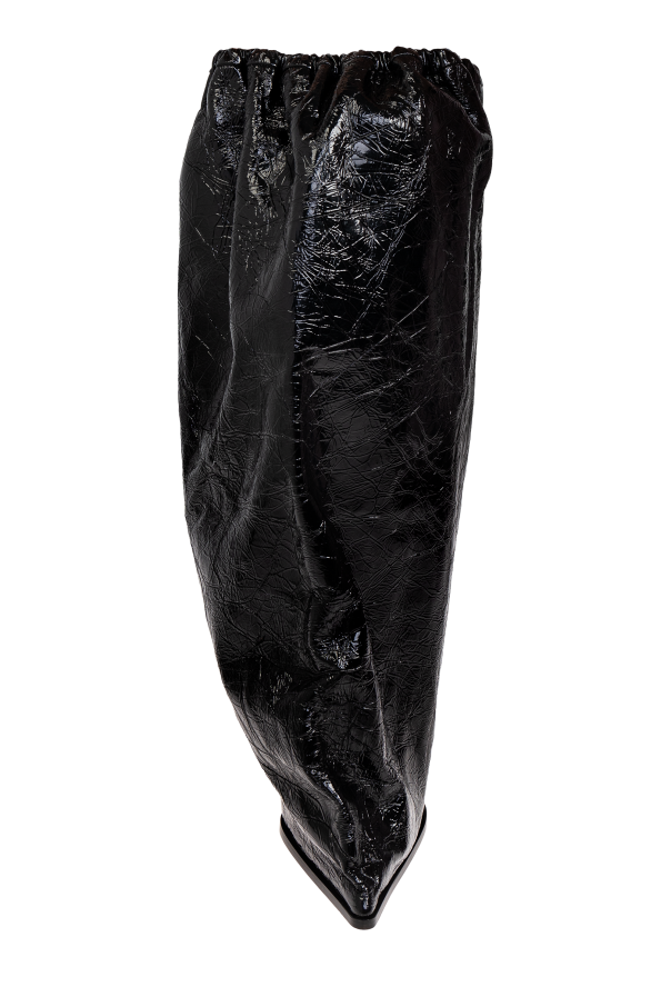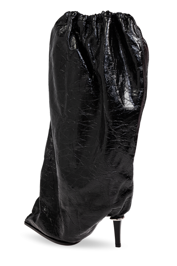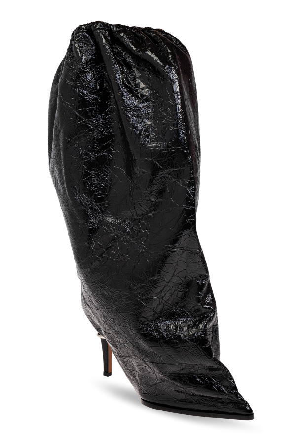 Introducing the Leather High-Heel Boots by the renowned Alexander McQueen. These exquisite black boots are crafted with a lustrous leather finish, exuding a modern and exclusive aura. The boots feature a relaxed, slouchy shaft, reminiscent of a baggy silhouette, and are accentuated by a slender, high heel that enhances their elegance and highlights a feminine style. The textured leather with a crumpled effect sets these boots apart, offering a unique touch that distinguishes them from the rest. The outer layer is made of premium leather, complemented by a leather and fabric interior, while the sole is crafted from durable rubber, ensuring both style and comfort. Designed for special occasions, these boots embody the brand\'s commitment to merging contrasts, honoring history and art, and epitomizing contemporary British tailoring. Why Choose This Product? Exquisite Design: A seamless blend of modern elegance and unique texture. Premium Materials: Crafted from high-quality leather and rubber for durability. Iconic Brand: Created by Alexander McQueen, a name synonymous with innovation and influence. Versatile Elegance: Perfect for making a statement at any special event.