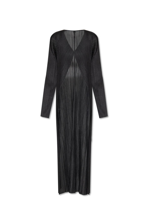 Black pleated coat with two slip pockets and long sleeves from Issey Miyake Pleats Please.