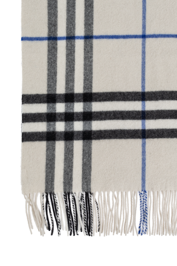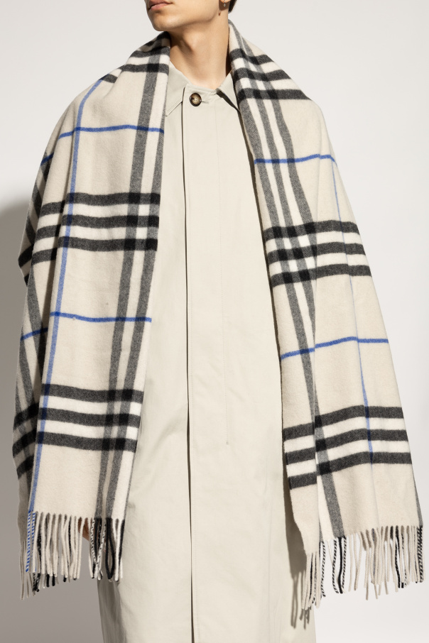 Introducing an epitome of sophistication and timeless design, the Burberry Cashmere Scarf. Crafted from 100% sumptuous cashmere, this accessory stands out with its understated grey palette, enriched by the iconic check pattern in black and blue hues. The design harks back to the classic British aesthetic, making it an essential addition to any discerning wardrobe. The scarf features a delicate fringe detailing on the shorter edges, lending an air of elegance and refinement. Its material boasts a softness and luxury that is synonymous with high-quality cashmere, ensuring both comfort and style. The presence of subtle blue lines intersecting the black stripes may serve as a hallmark of this exclusive piece, while a discreetly placed designer logo at the fringe\'s edge unmistakably identifies it as a distinguished part of Burberry\'s collection. Displayed on models in a variety of stylings, this unisex accessory demonstrates its versatility and the numerous ways it can enhance both men\'s and women\'s ensembles. The intricate pattern, combined with its luxurious feel, makes the Burberry Cashmere Scarf a coveted item in any exclusive clothing collection. Why Purchase This Product? Elegant and timeless British check pattern design. Exquisite craftsmanship from 100% high-quality cashmere. Versatile unisex accessory suitable for a multitude of styles. Signature Burberry detailing for an unmistakable luxury statement.