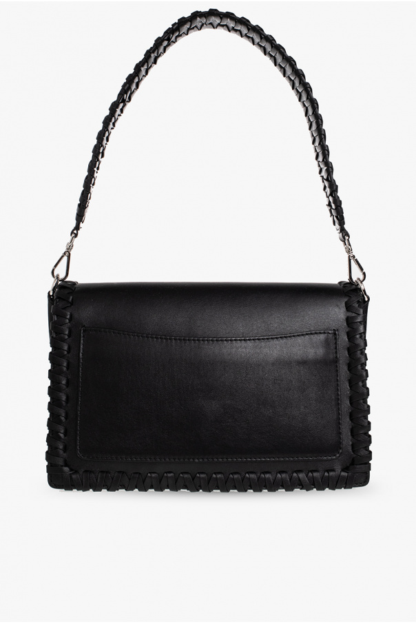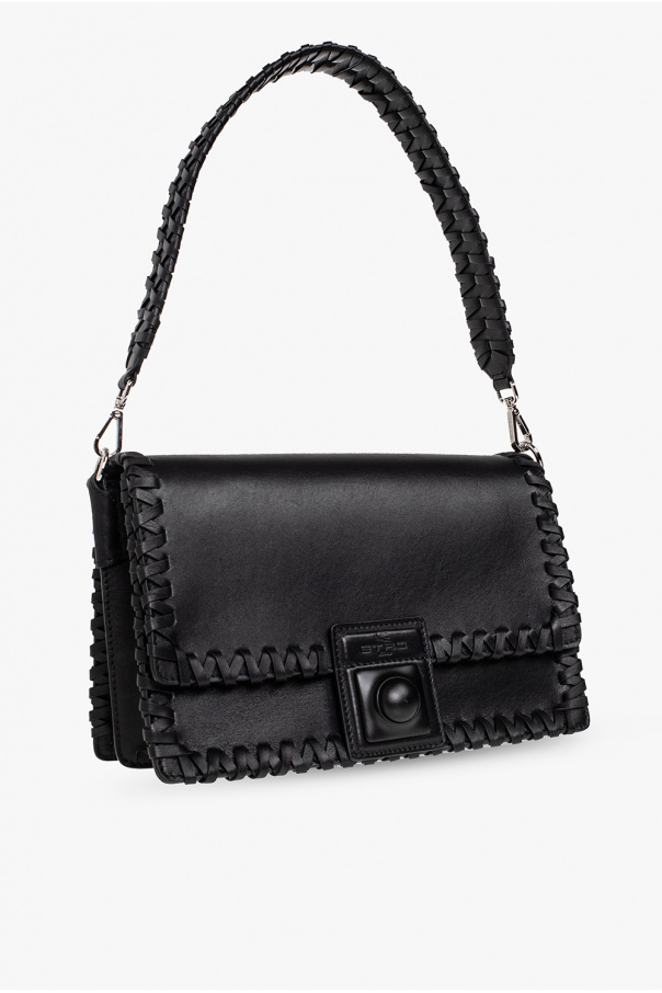 Black shoulder bag from Etro. Crafted from calf leather, this model is complete with snap fastening, decorative stitching details, embossed logo, back pocket, detachable handle, adjustable shoulder strap, silver-tone metal hardware and two separate internal compartments with one slip pocket.