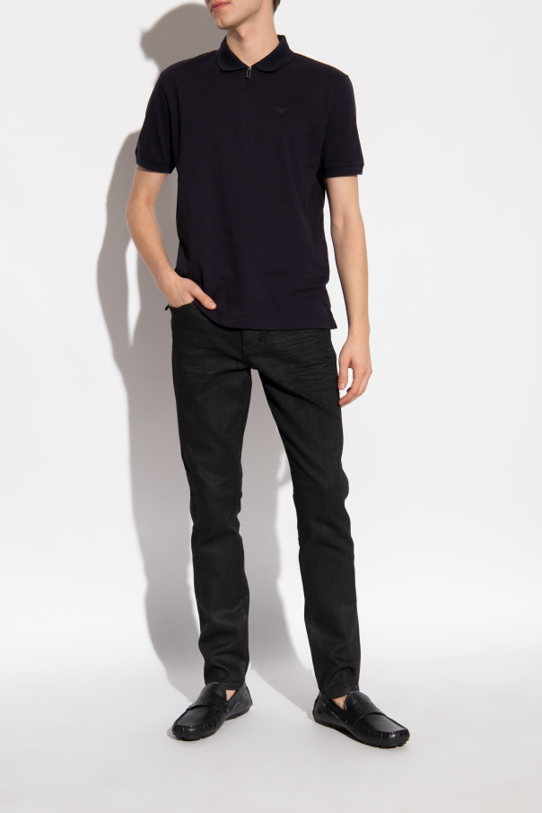 Black moccasins from Emporio Armani. Crafted from bovine leather, this model sits on a black rubber sole and features exposed stitching details and an embossed logo.