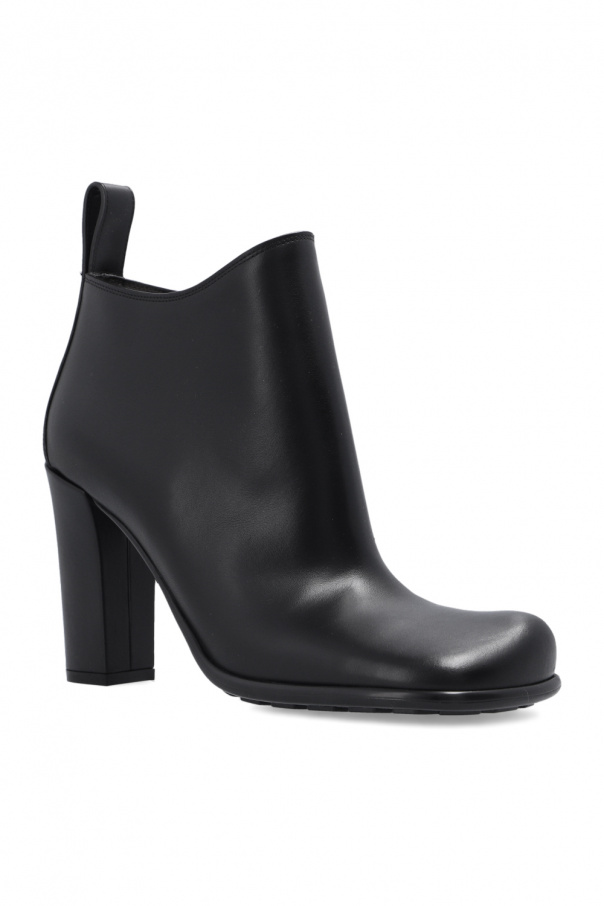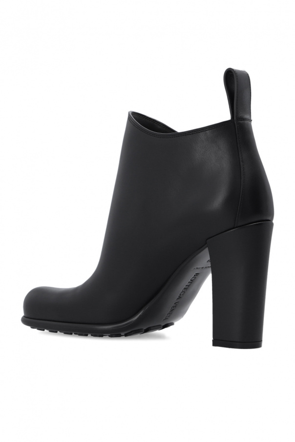 Black ‘Storm’ heeled ankle boots from Bottega Veneta. Crafted from calf leather, this pair rests on a black rubber sole and has a decorative toe.