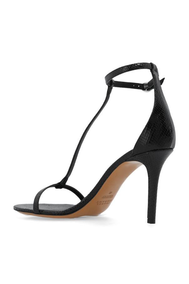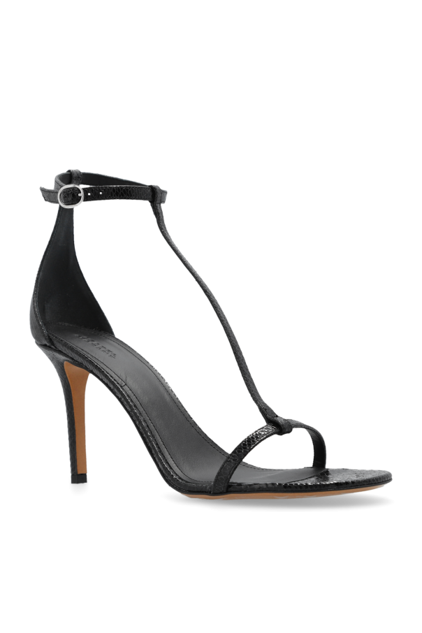 Black \'Eonie\' stiletto sandals from Isabel Marant. Crafted from textured goat leather, this model sits on a brown leather sole and features an ankle strap fastening.