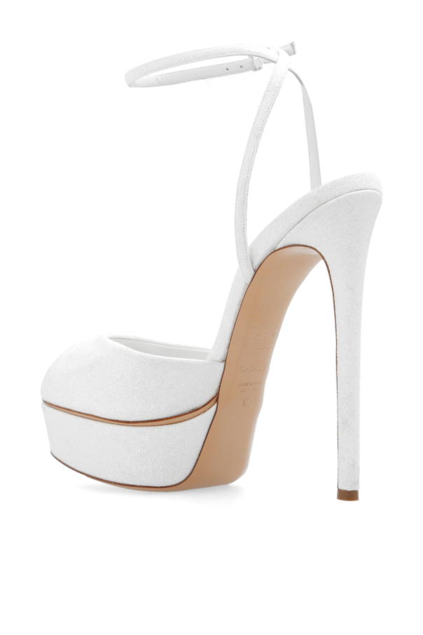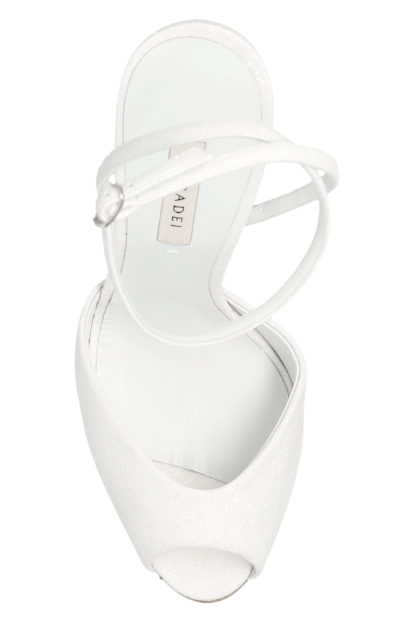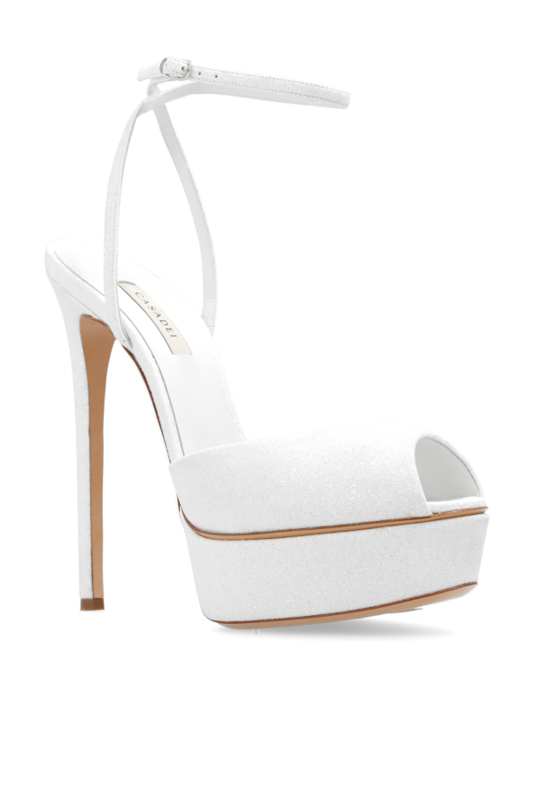 White ‘Flora Jolly’ platform sandals from Casadei. Made of fabric with a glitter finish, this design features an adjustable buckled ankle strap, cut-outs, almond toe and beige leather sole.