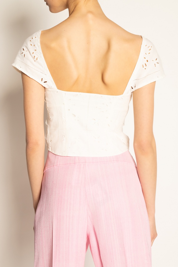 White ‘Le Haut Tovallo’ sleeveless crop top from Jacquemus. Fastened with buttons with a concealed placket, this garment is complete with a decorative buckle belt and openwork details.