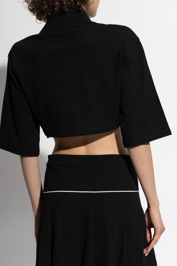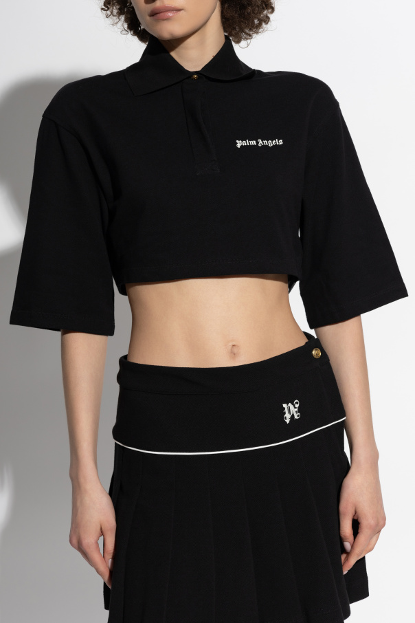 Introducing a sublime piece from the exclusive collection of Palm Angels, the Short Polo. This garment epitomizes refined elegance combined with luxurious details, creating a timeless addition to any sophisticated wardrobe. Crafted from premium-quality cotton, this polo offers unparalleled comfort and a soft texture reminiscent of classic polo design. The dominant black hue exudes a sense of understated chic, making it an ideal choice for both casual and elegant ensembles. The polo features a cropped cut, gracefully sitting above the waist, and wide three-quarter sleeves that add an element of contemporary flair. One cannot overlook the hallmark of the brand – the \"Palm Angels\" inscription in pristine white, subtly placed on the left chest, symbolizing the brand\'s distinctive identity. An elegant golden button adorns the collar, providing a touch of sophistication and serving as a subtle yet luxurious detail. The back of the polo is similarly cropped, tastefully revealing the lower back, perfect for pairing with a short skirt for a chic, casual look. Why choose this product? Exquisite Craftsmanship: Made from 100% high-quality cotton for superior comfort and durability. Distinctive Design: Features the iconic \"Palm Angels\" logo, a symbol of contemporary luxury. Elegant Details: Golden button on the collar adds a touch of sophisticated charm. Versatile Style: Perfect for both casual and elegant occasions, easily paired with various outfits.