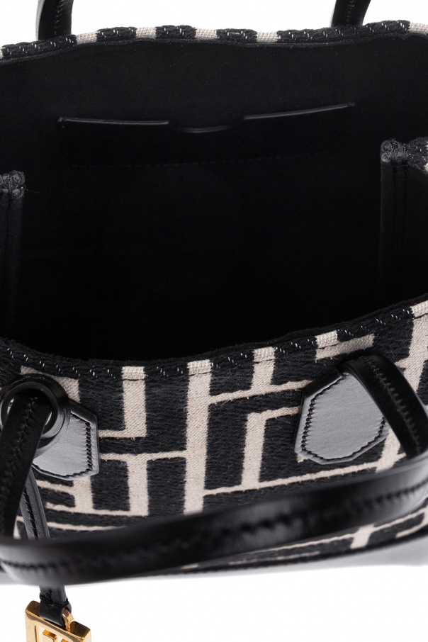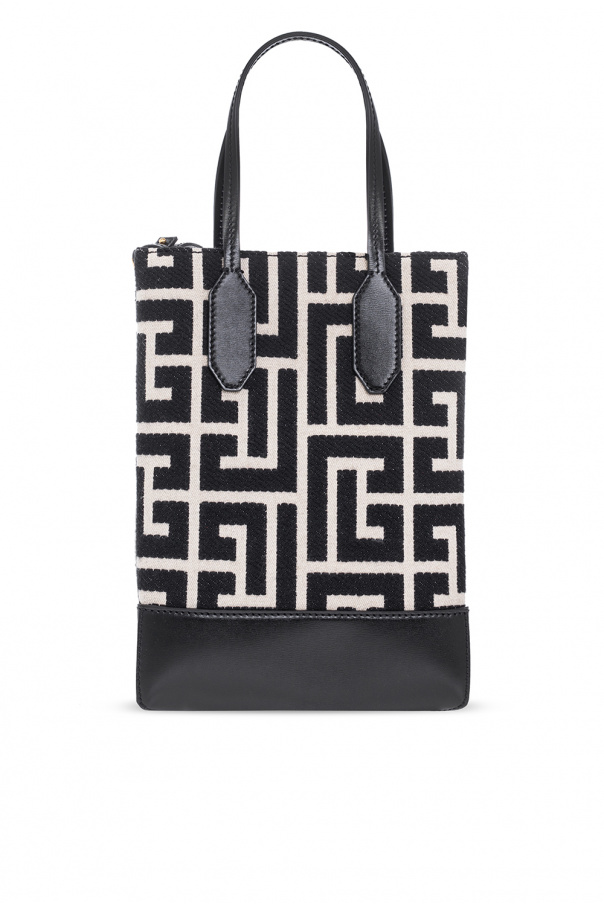 Black and beige shopper bag from Balmain. Crafted from canvas with a monogram, this model features a gold-tone logo print, two half-round handles, adjustable strap, gold-tone metal hardware and one internal compartment with one card slot.