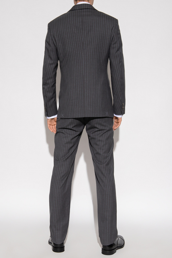 Grey suit from Giorgio Armani. Made of wool with light blue pinstripes, this ensemble includes a single-breasted blazer with button fastenings, notch lapels, three slip pockets, a single back vent and long sleeves with four buttons on the cuffs as well as trousers with a zip fly with a button, two side seam pockets, two back button pockets and slightly tapered legs.