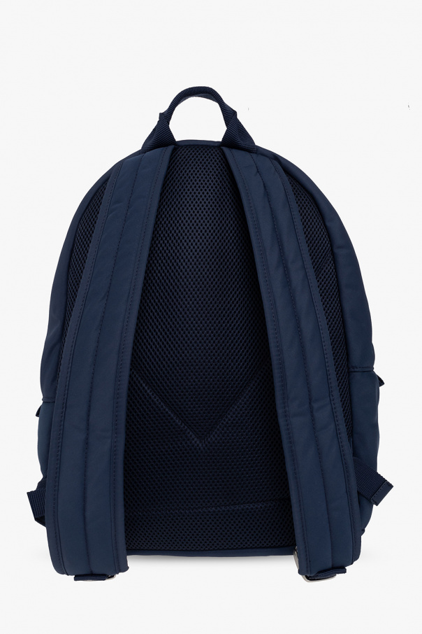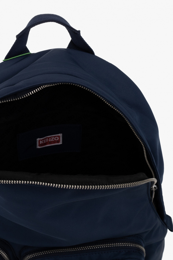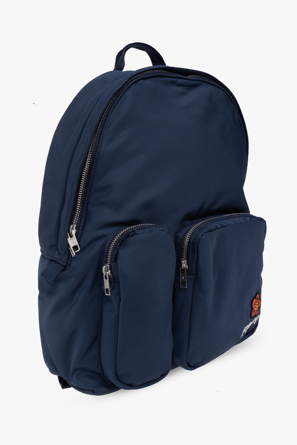 Navy backpack from Kenzo. Fastened with a two-way zip, this style is decorated with a white logo embroidery and patch with a floral motif. It is complete with two front zip pockets, half-round handle, adjustable shoulder straps and one internal compartment with one slip pocket and one card slot.