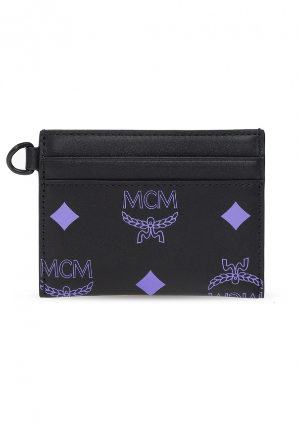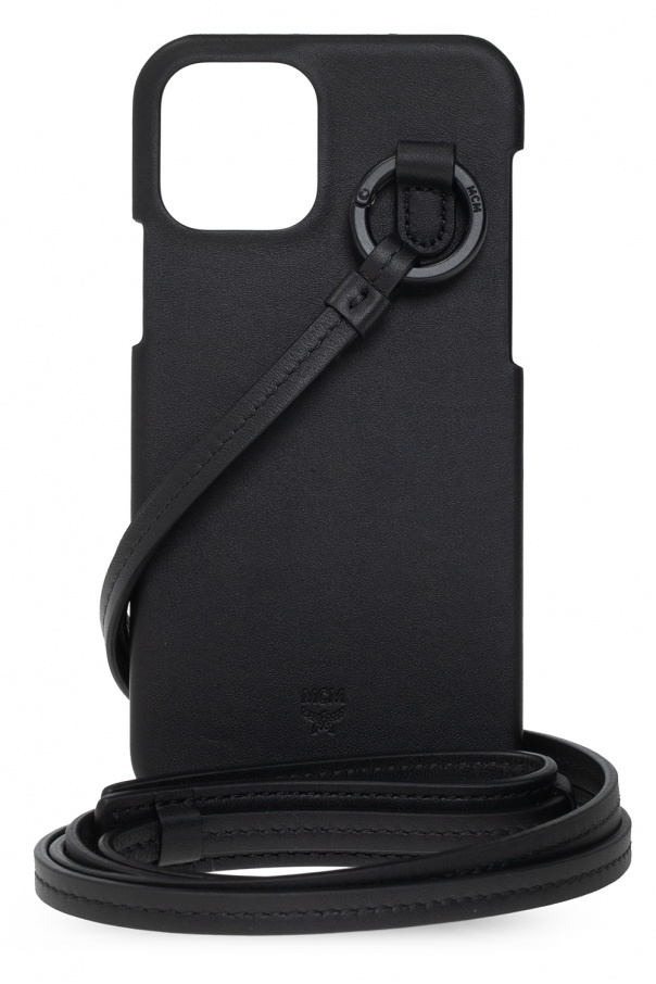 Black iPhone 12/12 Pro case from MCM. Made of bovine leather, this model features an embossed logo and a detachable card holder with a purple Visetos motif and five card slots.