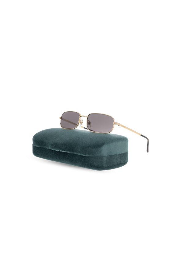 Gold-tone rectangular sunglasses from Gucci. Showcasing the brand\'s logo engraved on the temples, this pair features rounded edges of the frames and grey lenses with 100% UV protection. Comes with a case, whose colour is individually selected for each pair of glasses.