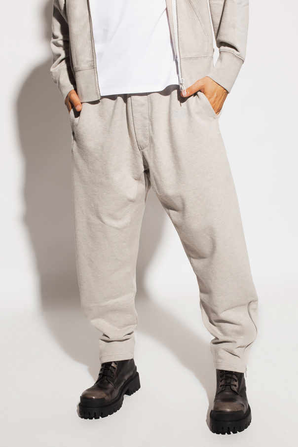 Grey sweatpants from Maison Margiela. Crafted from cotton, this pair falls down with tapered legs and features a drawstring waist, two frontal slip pockets, an embroidered logo on the front and back and zipped cuffs.