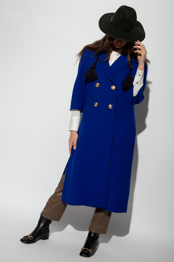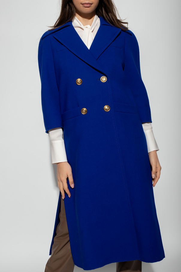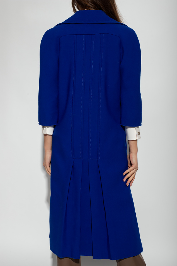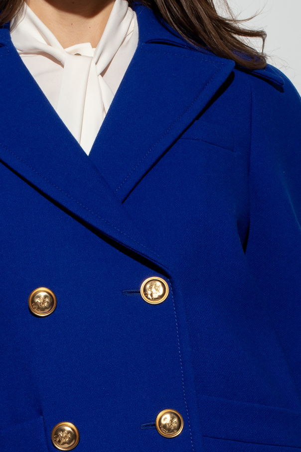 Navy double-breasted coat from Gucci. Made of wool, this long sleeve design features four slip pockets, peak lapels, double rear vent and raw-trimmed hem and cuffs.